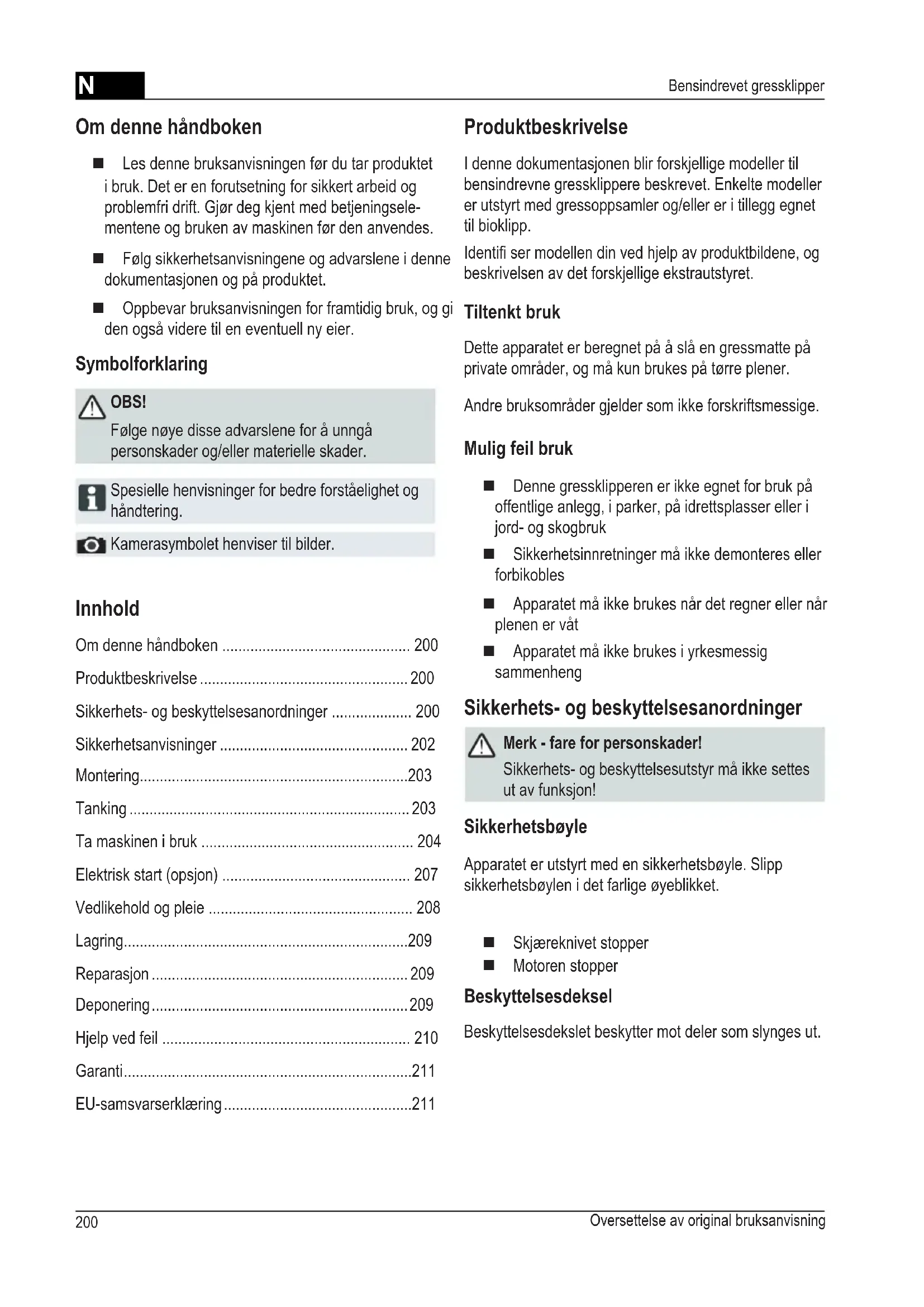 - EU-samsvarserklæring Om denne håndboken Les denne bruksanvisningen før du tar produktet i bruk. Det er en forutsetning for sikkert arbeid og problemfri drift. Gjør deg kjent med betjeningsele- mentene og bruken av maskinen før den anvendes. Følg sikkerhetsanvisningene og advarslene i denne dokumentasjonen og på produktet. Oppbevar bruksanvisningen for framtidig bruk, og gi den også videre til en eventuell ny eier. Symbolforklaring OBS! Følge nøye disse advarslene for å unngå personskader og/eller materielle skader. Spesielle henvisninger for bedre forståelighet og håndtering. Kamerasymbolet henviser til bilder. Kamerasymbolet henviser til bilder. Produktbeskrivelse I denne dokumentasjonen blir forskjellige modeller til bensindrevne gressklippere beskrevet. Enkelte modeller er utstyrt med gressoppsamler og/eller er i tillegg egnet til bioklipp. Identifi ser modellen din ved hjelp av produktbildene, og beskrivelsen av det forskjellige ekstrautstyret. Tiltenkt bruk Dette apparatet er beregnet på å slå en gressmatte på private områder, og må kun brukes på tørre plener. Andre bruksområder gjelder som ikke forskriftsmessige. Mulig feil bruk Denne gressklipperen er ikke egnet for bruk på offentlige anlegg, i parker, på idrettsplasser eller i jord- og skogbruk Sikkerhetsinnretninger må ikke demonteres eller forbikobles Apparatet må ikke brukes når det regner eller når plenen er våt Apparatet må ikke brukes i yrkesmessig sammenheng Sikkerhets- og beskyttelsesanordninger Merk - fare for personskader! Sikkerhets- og beskyttelsesutstyr må ikke settes ut av funksjon! Sikkerhetsbøyle Apparatet er utstyrt med en sikkerhetsbøyle. Slipp sikkerhetsbøylen i det farlige øyeblikket. Skjæreknivet stopper Motoren stopper Beskyttelsesdeksel Beskyttelsesdekslet beskytter mot deler som slynges ut.N p. 211