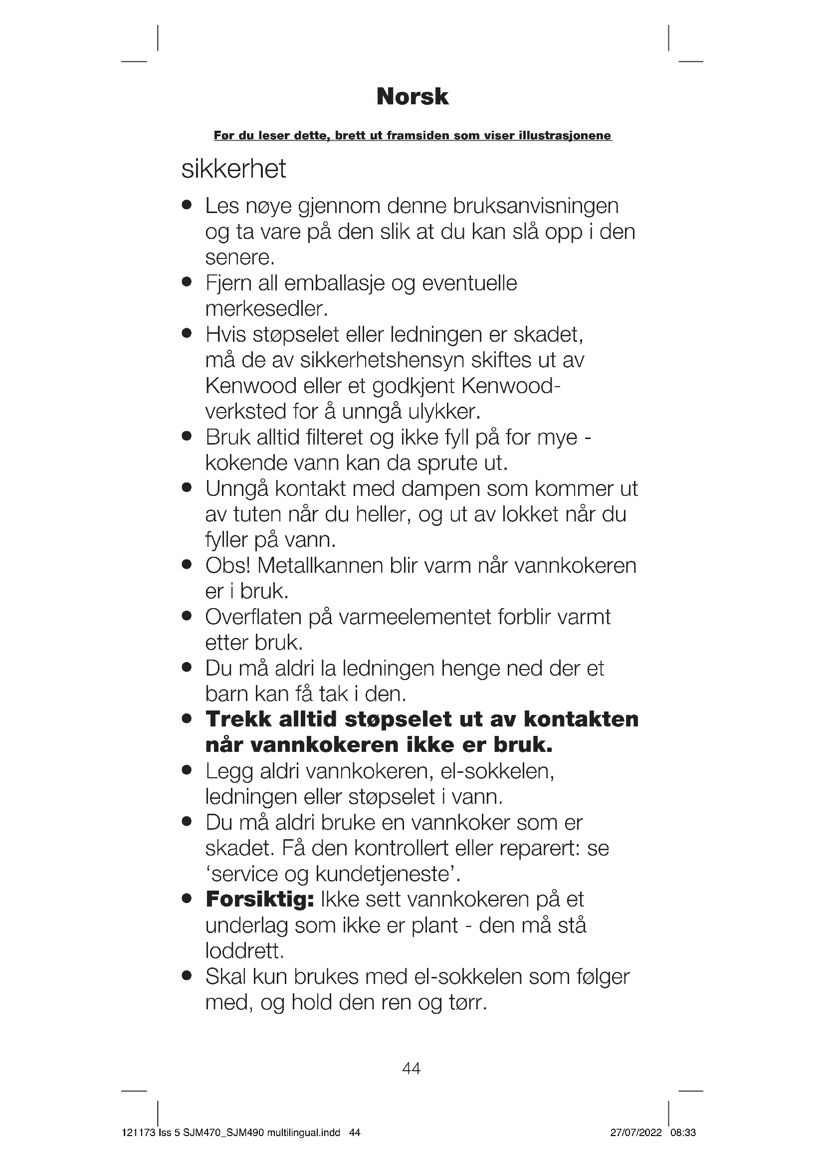 Skal kun brukes med el-sokkelen som følger med, og hold den ren og tørr. Norsk Før du leser dette, brett ut framsiden som viser illustrasjonene 121173 Iss 5 SJM470_SJM490 multilingual.indd 44121173 Iss 5 SJM470_SJM490 multilingual.indd 44 27/07/2022 08:3327/07/2022 08:3345