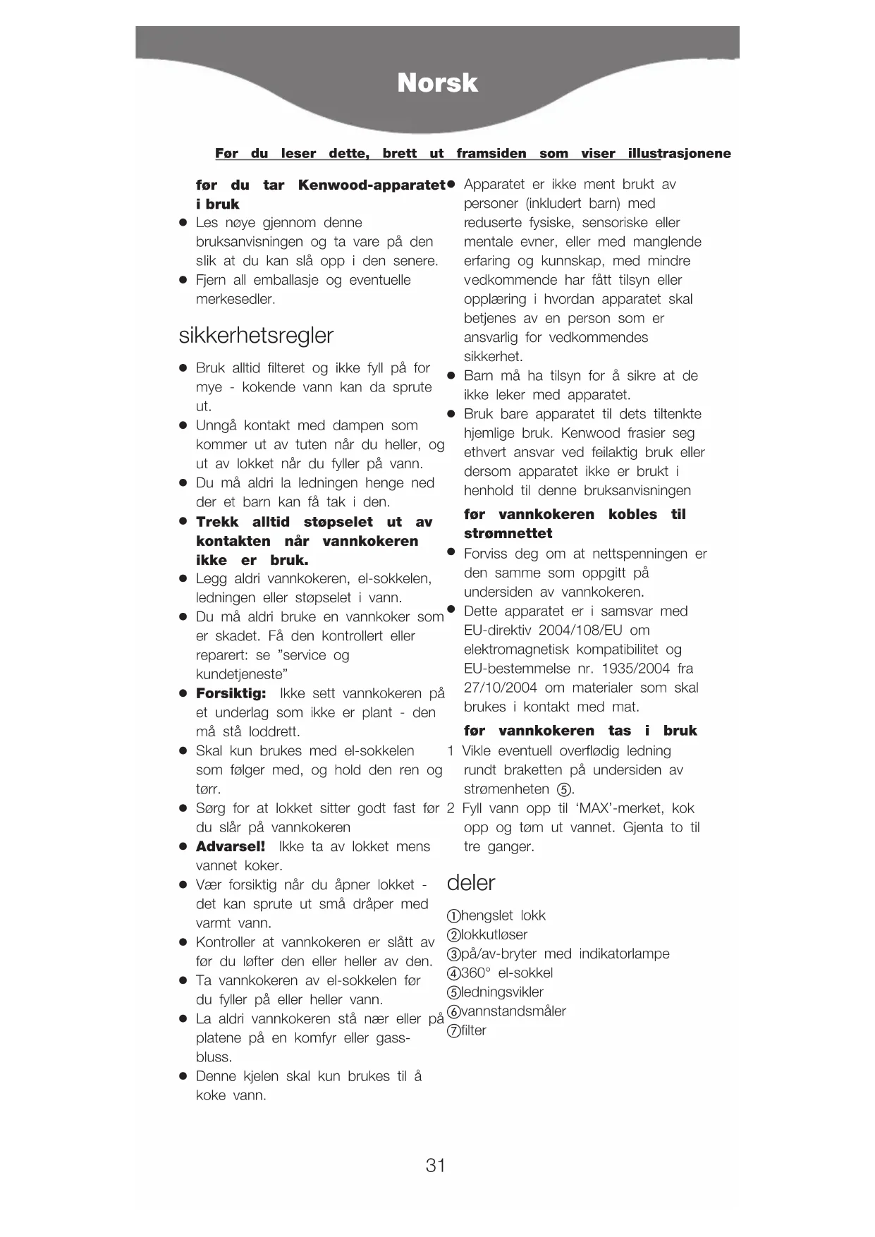 Dette apparatet er i samsvar med EU-direktiv 2004/108/EU om elektromagnetisk kompatibilitet og EU-bestemmelse nr. 1935/2004 fra 27/10/2004 om materialer som skal brukes i kontakt med mat. før vannkokeren tas i bruk 1 Vikle eventuell overflødig ledning rundt braketten på undersiden av strømenheten . 2 Fyll vann opp til ‘MAX’-merket, kok opp og tøm ut vannet. Gjenta to til tre ganger. deler hengslet lokk lokkutløser på/av-bryter med indikatorlampe 360° el-sokkel ledningsvikler vannstandsmåler filter
