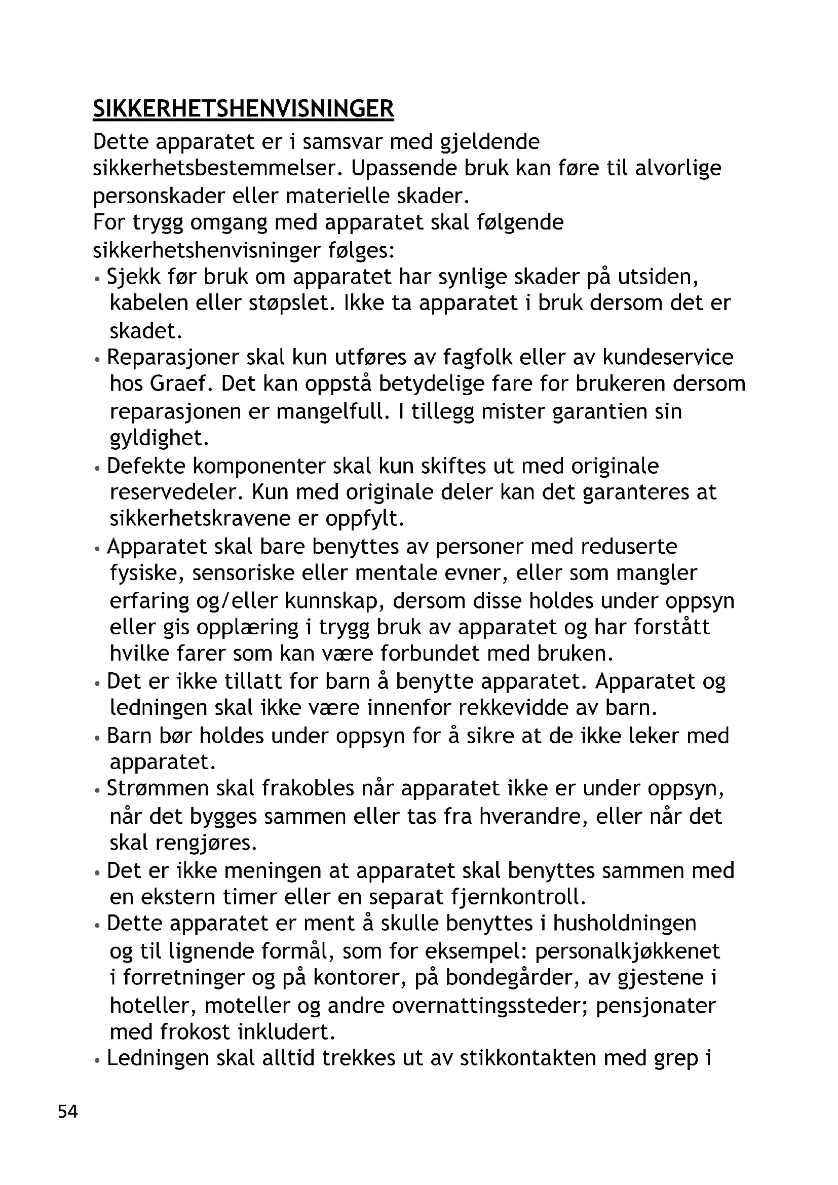 - Tøm apparatet og skyll det ere ganger med rent vann. Merk: Du kan også benytte andre egnede avkalkningsmetoder. Følg i den forbindelse produsentens anvisninger. KUNDESERVICE Dersom det skulle oppstå en defekt på ditt apparat fra Graef kan du henvende deg til din forhandler eller til kundeservice hos Graef. DEPONERING Dette produktet skal ikke kastes sammen med det vanlige husholdningsavfallet når det har nådd slutten av sin levetid. Symbolet på produktet og i bruksanvisningen gir en henvisning om dette. Materialene produktet er laget av kan resirkuleres ut fra sin merking. Du yter et viktig bidrag til beskyttelse av miljøet vårt ved å bidra til resirkulering eller andre former for ny utnyttelse av gamle apparater og deres komponenter og materialer. Vennligst spør den lokale forvaltningen om hva som er det ansvarlige innsamlingsstedet. GARANTIE For dette produktet påtar vi oss 24 måneders produsentgaranti, beregnet fra salgsdatoen, for mangler som kan tilbakeføres til produksjonsfeil eller materielle mangler. Dine rettslige garantikrav i henhold til § 439 ff. i den tyske BGB-E forblir upåvirket av denne reguleringen. Garantien omfatter ikke skader som oppsto som følge av upassende håndtering eller bruksområder, samt mangler som kun i beskjeden grad påvirker apparatets funksjon eller verdi. Dessuten påtar vi oss intet ansvar for skader som oppstår som følge av manglende eller utilstrekkelig avkalkning og tilsyn. I slike situasjoner går tilsvarende garantien tapt. Videre er transportskader som vi ikke er ansvarlige for heller ikke omfattet av garantien. Skader som ble forårsaket60 av en reparasjon som ikke ble utført av oss eller en av våre representanter vil tilsvarende ikke være omfattet av garantien. Ved berettigede reklamasjoner kommer vi etter eget skjønn til å velge mellom en reparasjon av det mangelfulle produkteteller å bytte ut dette med et produkt uten mangler.61