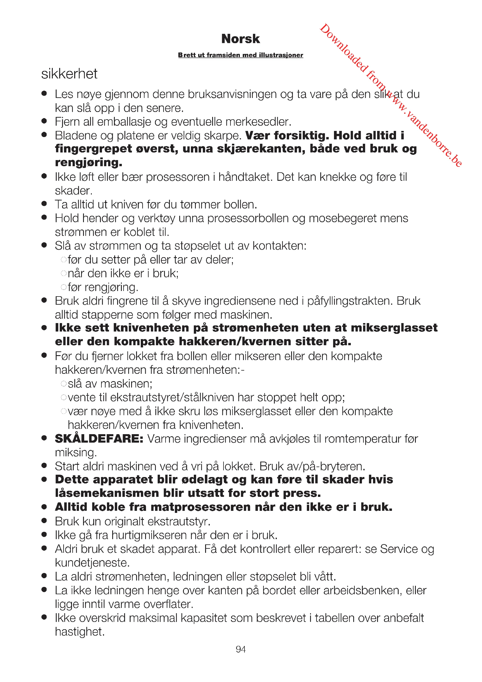 itter som de skal. Kompakt hakker/kvern fungerer ikke. Kompakt hakker/kvern ikke satt ordentlig Den kompakte hakkeren/kvernen på enheten. fungerer ikke hvis den ikke er satt riktig inn i låsemekanismen. Kompakt hakker/kvern ikke satt sammen Sjekk at knivenheten er strammet korrekt. helt til på glasset til den kompakte hakkeren/kvernen. Hurtigmikser vil ikke fungere. Hurtigmikser er ikke låst riktig. Mikseren fungerer ikke slik den skal hvis alt ikke er låst fast slik det skal. Hurtigmikser er ikke montert riktig. Kontroller at bladenheten er helt strammet i muggen. Prosessoren stanser eller begynner å sakke Overbelastningsbeskyttelse i bruk. Slå av, trekk ut kontakten og la farten under behandlingen. Prosessoren ble overbelastet eller maskinen avkjøle seg i ca. 15 overopphetet under bruk. minutter. Maksimal kapasitet overskredet. Se oversikten over anbefalte hastigheter for maksimal kapasitet for behandling. veiefunksjon displayskjerm viser konstant [- - - -]. Veid mengde for liten. Mål ut med teskje eller spiseskje når det dreier seg om svært små mengder. Vekten endres på displayskjermen. Motordelen flyttet mens maskinen var i bruk. Ikke flytt på enheten mens den er i bruk. Sett displayet på null før du veier neste ingrediens. Hurtigmikseren lekker nederst på knivenheten. Tetningsringen er borte. Sjekk at forseglingen er satt riktig på Tetningsringen er feil satt på og ikke er skadet. Tetningsringen er skadet. For å få en ny forsegling ser du ‘Service og kundetjeneste’. Mikserforsegling mangler fra bladenhet når Forseglingen pakkes ferdigmontert på Skru av begeret og sjekk at den tas ut av emballasjen. bladenheten. forseglingen sitter på bladenheten. For å få en ny forsegling ser du ‘Service og kundetjeneste’. Redskapet/tilbehøret fungerer dårlig. Se tipsene i relevant del under “Bruke tilbehøret”. Sjekk at tilbehøret er satt sammen riktig. Downloaded from www.vandenborre.beturvallisuus