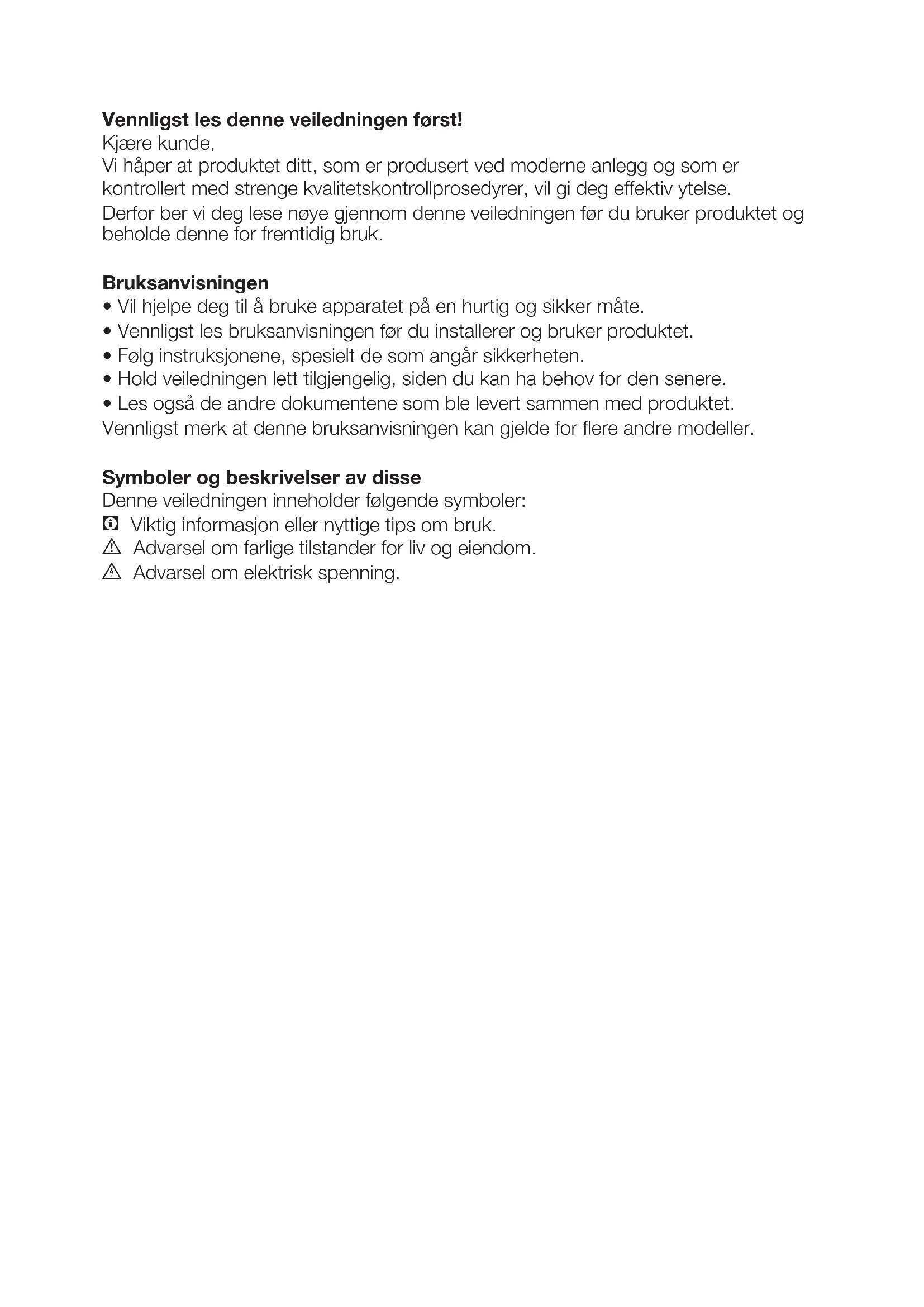 - Les også de andre dokumentene som ble levert sammen med produktet. Vennligst merk at denne bruksanvisningen kan gjelde for flere andre modeller. Symboler og beskrivelser av disse Denne veiledningen inneholder følgende symboler: C Viktig informasjon eller nyttige tips om bruk. A Advarsel om farlige tilstander for liv og eiendom. B Advarsel om elektrisk spenning.NO