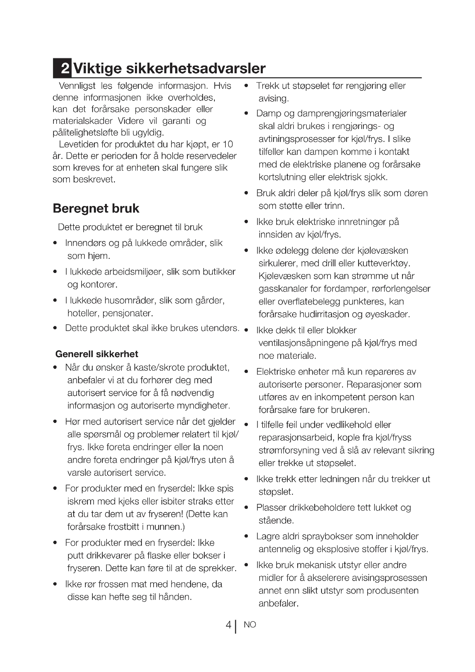 - Dette kjøl/frys er kun beregnet til for å oppbevare mat. Det skal ikke brukes til noen andre formål.
