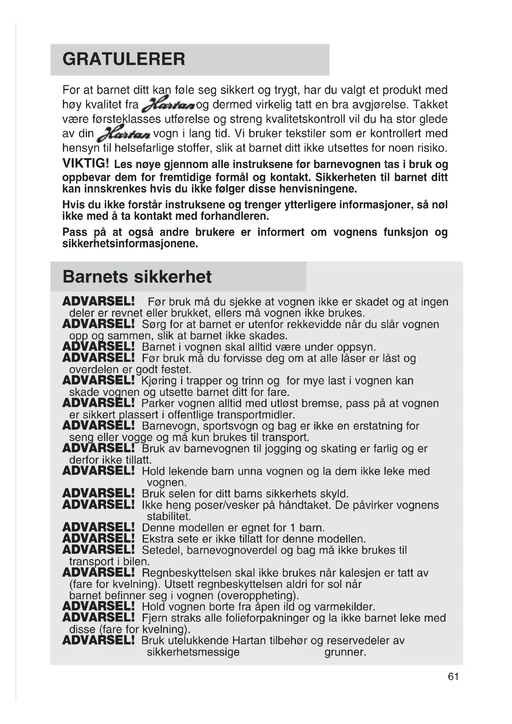 Barnevognen er et transportmiddel for ditt barn og skal pleies og vedlikeholdes i henhold til bruksanvisningen for å bevare dens opprinnelige kvalitet..