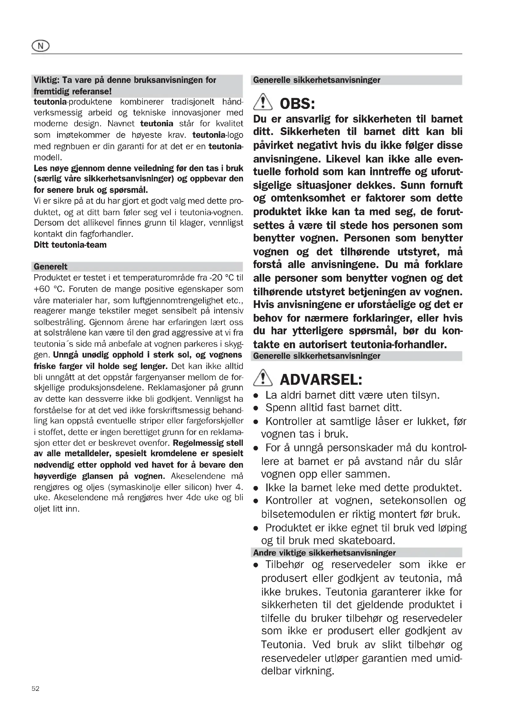 Du er ansvarlig for sikkerheten til barnet ditt. Sikkerheten til barnet ditt kan blipavirket negativt hvis du ikke ffolgerppe anvisingene. Likevel kan ikke alle eventuelle forhold som kan inntreffe og uforutsigelige situasjoner dekkes. Sunn fornuft og omtenksomhet er faktorer som detteprodukter ikke kan ta med seg, de forutsettes à vare til stede hos Personen som benytter vognen. Personen som benytter vognen og det tilhorende utstyret, ma forsta alle anvisingene. Du mA forklare alle personer som benytter vognen og det tilhorende utstyret betjeningen av vognen. Hvis anvisingene er uforstælige og det er behov for nærmere forsklaringer, eller hvis du har ytterligere spørsmål, bør du kontakte en autorisert teutonia-forhandler.