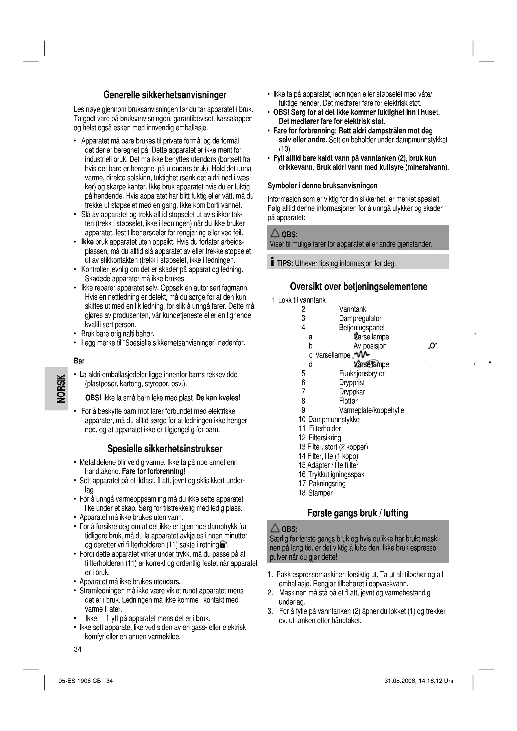 - Fyll alltid bare kaldt vann på vanntanken (2), bruk kun drikkevann. Bruk aldri vann med kullsyre (mineralvann). Symboler i denne bruksanvisningen Informasjon som er viktig for din sikkerhet, er merket spesielt. Følg alltid denne informasjonen for å unngå ulykker og skader på apparatet: OBS: Viser til mulige farer for apparatet eller andre gjenstander. TIPS: Uthever tips og informasjon for deg. Oversikt over betjeningselementene 1 Lokk til vanntank 2 Vanntank 3 Dampregulator 4 Betjeningspanel a Varsellampe „ “ b Av-posisjon „O“ c Varsellampe „ “ d Varsellampe „ / “ 5 Funksjonsbryter 6 Drypprist 7 Dryppkar 8 Flottør 9 Varmeplate/koppehylle 10 Dampmunnstykke 11 Filterholder 12 Filtersikring 13 Filter, stort (2 kopper) 14 Filter, lite (1 kopp) 15 Adapter / lite fi lter 16 Trykkutligningsspak 17 Pakningsring 18 Stamper Første gangs bruk / lufting OBS: Særlig før første gangs bruk og hvis du ikke har brukt maski- nen på lang tid, er det viktig å lufte den. Ikke bruk espresso- pulver når du gjør dette!