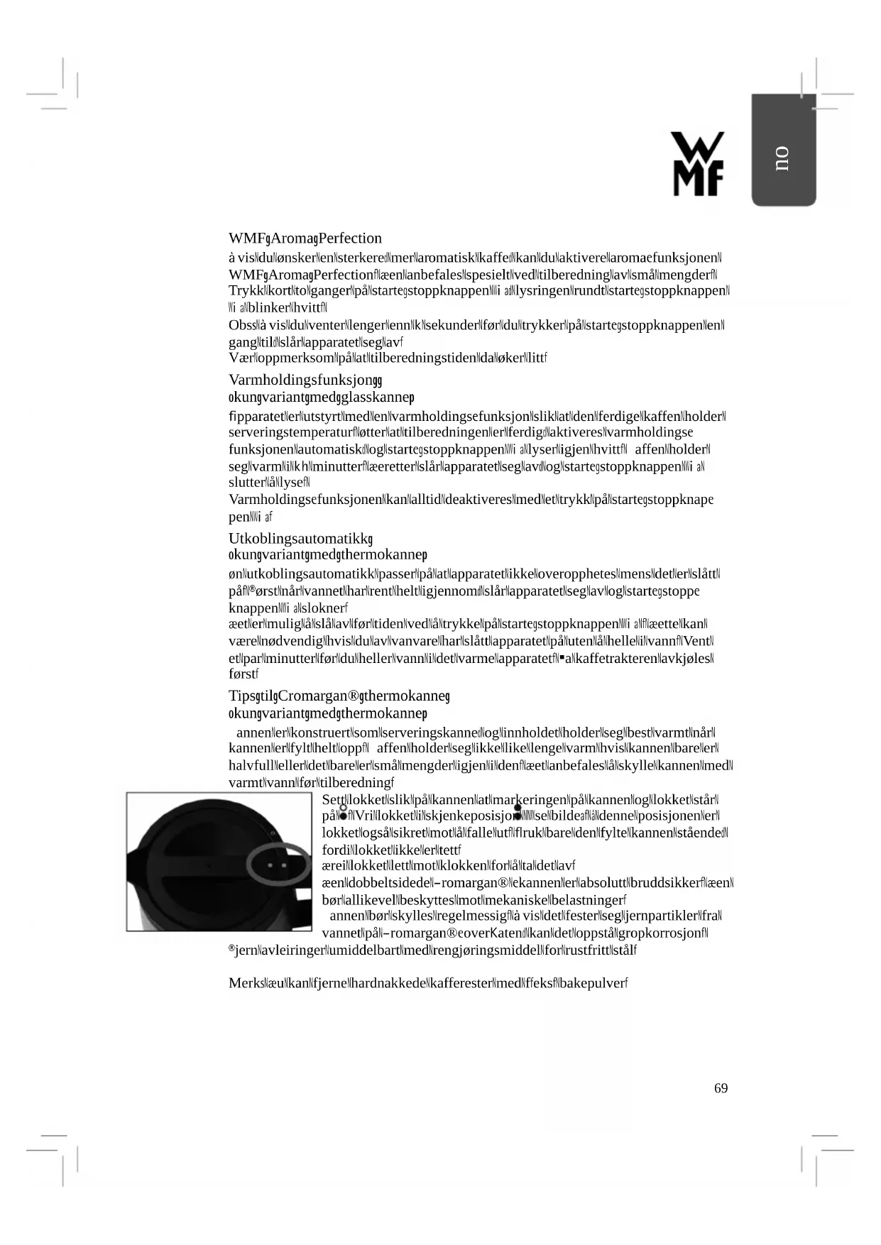 WMF Aroma Perfection Hvis du ønsker en sterkere, mer aromatisk kaffe, kan du aktivere aroma-funksjonen WMF Aroma Perfection. Den anbefales spesielt ved tilberedning av små mengder. Trykk kort to ganger på start-/stoppknappen (1), lysringen rundt start-/stoppknappen (1) blinker hvitt. Obs: Hvis du venter lenger enn 3 sekunder før du trykker på start-/stoppknappen en gang til, slår apparatet seg av. Vær oppmerksom på at tilberedningstiden da øker litt. Varmholdingsfunksjon (kun variant med glasskanne) Apparatet er utstyrt med en varmholdings-funksjon slik at den ferdige kaffen holder serveringstemperatur. Etter at tilberedningen er ferdig, aktiveres varmholdings- funksjonen automatisk, og start-/stoppknappen (1) lyser igjen hvitt. Kaffen holder seg varm i 30 minutter. Deretter slår apparatet seg av, og start-/stoppknappen (1) slutter å lyse. Varmholdings-funksjonen kan alltid deaktiveres med et trykk på start-/stoppknap- pen (1). Utkoblingsautomatikk (kun variant med thermokanne) En utkoblingsautomatikk passer på at apparatet ikke overopphetes mens det er slått på. Først når vannet har rent helt igjennom, slår apparatet seg av og start-/stopp- knappen (1) slokner. Det er mulig å slå av før tiden ved å trykke på start-/stoppknappen (1) . Dette kan være nødvendig hvis du av vanvare har slått apparatet på uten å helle i vann. Vent et par minutter før du heller vann i det varme apparatet. La kaffetrakteren avkjøles først. Tips til Cromargan® thermokanne (kun variant med thermokanne) Kannen er konstruert som serveringskanne, og innholdet holder seg best varmt når kannen er fylt helt opp. Kaffen holder seg ikke like lenge varm hvis kannen bare er halvfull eller det bare er små mengder igjen i den. Det anbefales å skylle kannen med varmt vann før tilberedning. Sett lokket slik på kannen at markeringen på kannen og lokket står