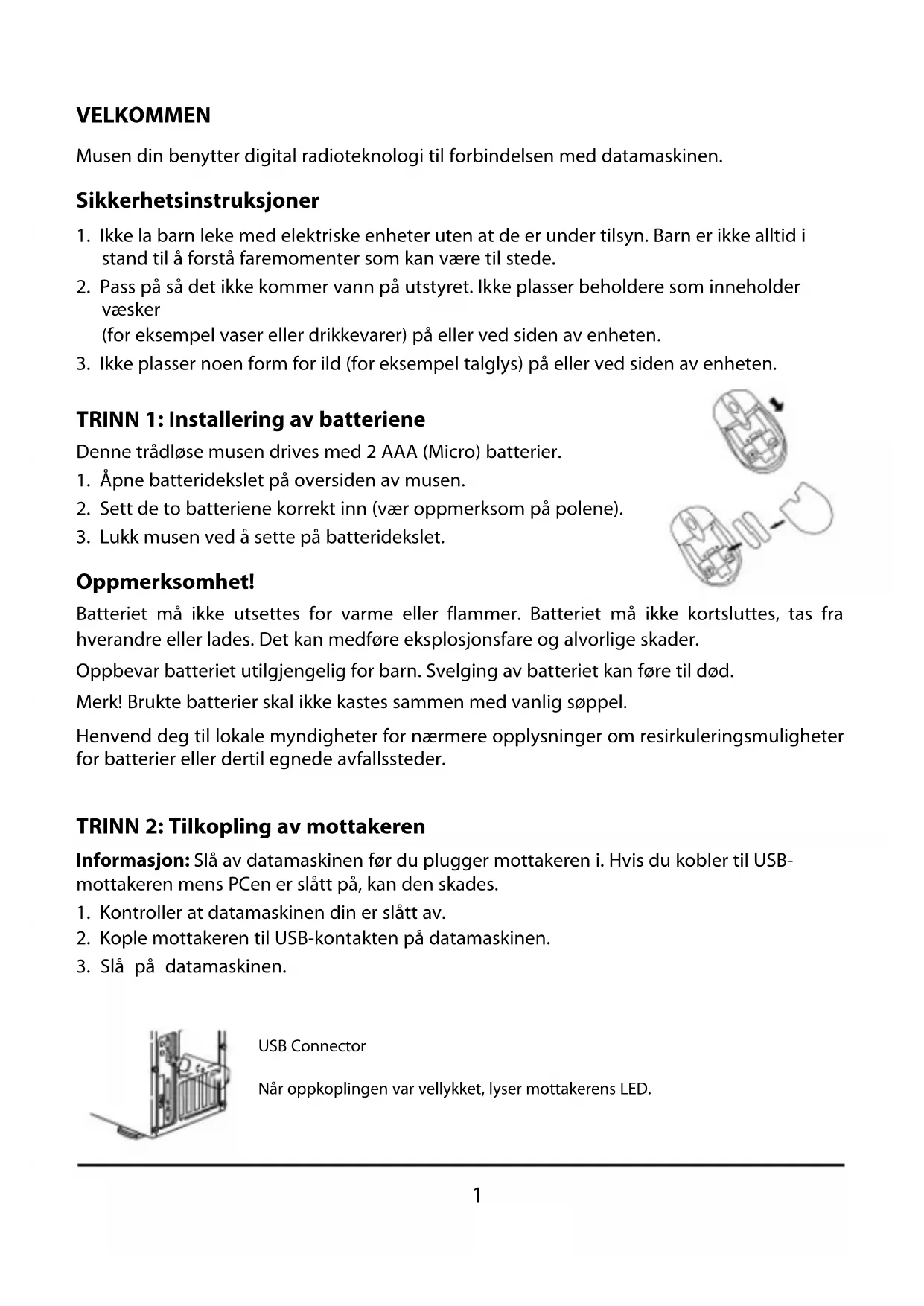 Oppmerksomhet! Batteriet må ikke utsettes for varme eller flammer. Batteriet må ikke kortsluttes, tas fra hverandre eller lades. Det kan medføre eksplosjonsfare og alvorlige skader. Oppbevar batteriet utilgjengelig for barn. Svelging av batteriet kan føre til død. Merk! Brukte batterier skal ikke kastes sammen med vanlig søppel. Henvend deg til lokale myndigheter for nærmere opplysninger om resirkuleringsmuligheter for batterier eller dertil egnede avfallssteder. TRINN 2: Tilkopling av mottakeren Informasjon: Slå av datamaskinen før du plugger mottakeren i. Hvis du kobler til USB- mottakeren mens PCen er slått på, kan den skades.