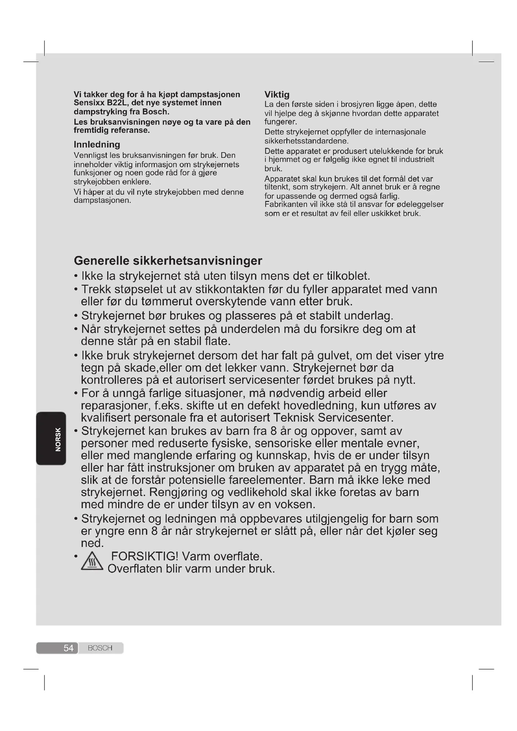 Apparatet når høye temperaturer og produserer damp mens det brukes, noe som kan resultere i skolding eller forbrenning ved uforsiktig bruk. Dampslangen, basestasjonen, metallplaten på bunnen av det avtagbare strykejernsunderlaget (2) og spesielt strykejernet kan bli varme under bruk. Dette er normalt. Ikke rett strykejernet mot personer eller dyr. Ikke tillat at ledningen kommer i kontakt med undersiden av strykejernet mens det er varmt. Vær oppmerksom på at strykejernet kan fortsette å avgi damp også kort tid etter at damputløseren er frigitt. Dette er normalt.55 B O S C H La den første siden i brosjyren ligge åpen, dette vil hjelpe deg å skjønne hvordan dette apparatet fungerer.Dette strykejernet oppfyller de internasjonale sikkerhetsstandardene.Dette apparatet er produsert utelukkende for bruk i hjemmet og er følgelig ikke egnet til industrielt bruk.Apparatet skal kun brukes til det formål det var tiltenkt, som strykejern. Alt annet bruk er å regne for upassende og dermed også farlig. Fabrikanten vil ikke stå til ansvar for ødeleggelser som er et resultat av feil eller uskikket bruk.