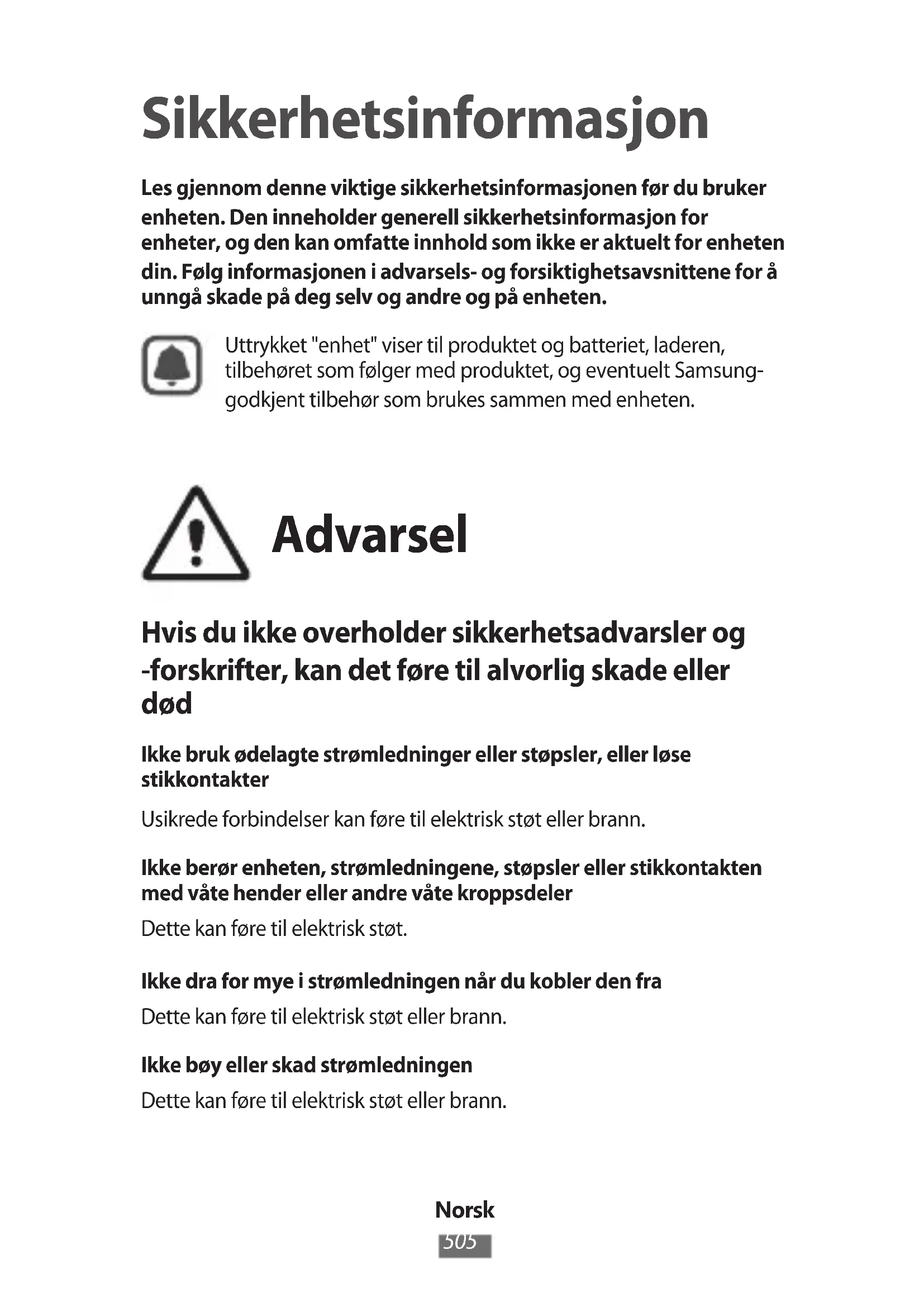 Sikkerhetsinformasjon Les gjennom denne viktige sikkerhetsinformasjonen før du bruker enheten. Den inneholder generell sikkerhetsinformasjon for enheter, og den kan omfatte innhold som ikke er aktuelt for enheten din. Følg informasjonen i advarsels- og forsiktighetsavsnittene for å unngå skade på deg selv og andre og på enheten. Uttrykket "enhet" viser til produktet og batteriet, laderen, tilbehøret som følger med produktet, og eventuelt Samsung- godkjent tilbehør som brukes sammen med enheten. Advarsel Hvis du ikke overholder sikkerhetsadvarsler og -forskrifter, kan det føre til alvorlig skade eller død Ikke bruk ødelagte strømledninger eller støpsler, eller løse stikkontakter Usikrede forbindelser kan føre til elektrisk støt eller brann. Ikke berør enheten, strømledningene, støpsler eller stikkontakten med våte hender eller andre våte kroppsdeler Dette kan føre til elektrisk støt. Ikke dra for mye i strømledningen når du kobler den fra Dette kan føre til elektrisk støt eller brann. Ikke bøy eller skad strømledningen Dette kan føre til elektrisk støt eller brann.Norsk