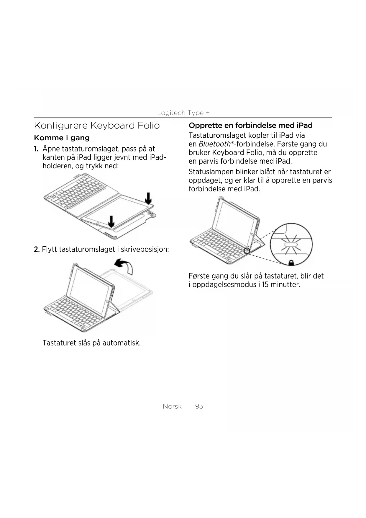 Tastaturet slås på automatisk. Opprette en forbindelse med iPad Tastaturomslaget kopler til iPad via en Bluetooth®-forbindelse. Første gang du bruker Keyboard Folio, må du opprette en parvis forbindelse med iPad. Statuslampen blinker blått når tastaturet er oppdaget, og er klar til å opprette en parvis forbindelse med iPad. Første gang du slår på tastaturet, blir det i oppdagelsesmodus i 15 minutter.Logitech Type + 94 Norsk Hvis statuslampen lyser rødt, bør du lade batteriet. Du finner mer informasjon om dette under "Lade tastaturbatteriet". Opprette en parvis forbindelse mellom Keyboard Folio og iPad: