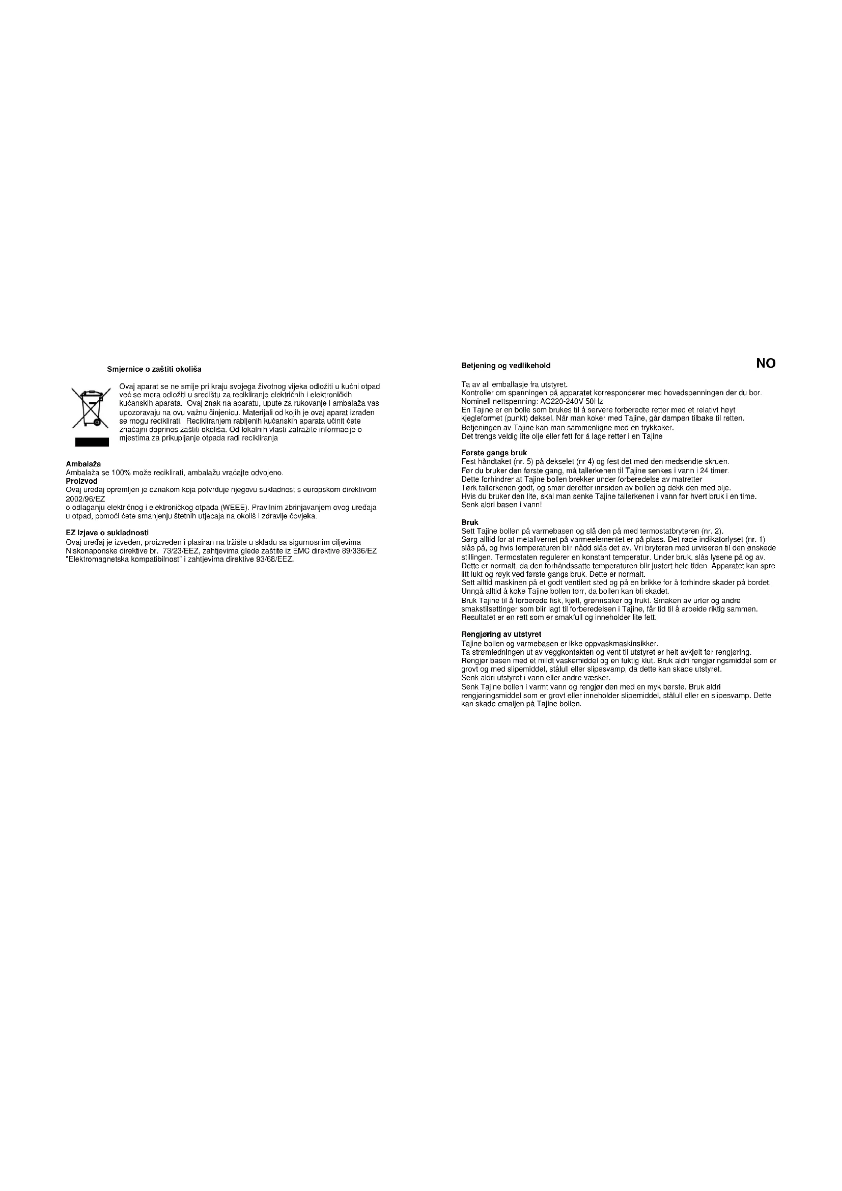 Ta av all emballasje fra utstyret. Kontroller om spenningen på apparatet korresponderer med hovedspenningen der du bor. Nominell nettspenning: AC220-240V 50Hz En Tajine er en bolle som brukes til å servere forberedte retter med et relativt høyt kjegleformet (punkt) deksel. Når man koker med Tajine, går dampen tilbake til retten. Betjeningen av Tajine kan man sammenligne med en trykkoker. Det trengs veldig lite olje eller fett for å lage retter i en Tajine Første gangs bruk Fest håndtaket (nr. 5) på dekselet (nr 4) og fest det med den medsendte skruen. Før du bruker den første gang, må tallerkenen til Tajine senkes i vann i 24 timer. Dette forhindrer at Tajine bollen brekker under forberedelse av matretter Tørk tallerkenen godt, og smør deretter innsiden av bollen og dekk den med olje. Hvis du bruker den lite, skal man senke Tajine tallerkenen i vann før hvert bruk i en time. Senk aldri basen i vann! Bruk Sett Tajine bollen på varmebasen og slå den på med termostatbryteren (nr. 2). Sørg alltid for at metallvernet på varmeelementet er på plass. Det røde indikatorlyset (nr. 1) slås på, og hvis temperaturen blir nådd slås det av. Vri bryteren med urviseren til den ønskede stillingen. Termostaten regulerer en konstant temperatur. Under bruk, slås lysene på og av. Dette er normalt, da den forhåndssatte temperaturen blir justert hele tiden. Apparatet kan spre litt lukt og røyk ved første gangs bruk. Dette er normalt. Sett alltid maskinen på et godt ventilert sted og på en brikke for å forhindre skader på bordet. Unngå alltid å koke Tajine bollen tørr, da bollen kan bli skadet. Bruk Tajine til å forberede fisk, kjøtt, grønnsaker og frukt. Smaken av urter og andre smakstilsettinger som blir lagt til forberedelsen i Tajine, får tid til å arbeide riktig sammen. Resultatet er en rett som er smakfull og inneholder lite fett. Rengjøring av utstyret Tajine bollen og varmebasen er ikke oppvaskmaskinsikker. Ta strømledningen ut av veggkontakten og vent til utstyret er helt avkjølt før rengjøring. Rengjør basen med et mildt vaskemiddel og en fuktig klut. Bruk aldri rengjøringsmiddel som er grovt og med slipemiddel, stålull eller slipesvamp, da dette kan skade utstyret. Senk aldri utstyret i vann eller andre væsker. Senk Tajine bollen i varmt vann og rengjør den med en myk børste. Bruk aldri rengjøringsmiddel som er grovt eller inneholder slipemiddel, stålull eller en slipesvamp. Dette kan skade emaljen på Tajine bollen.VIKTIGE SIKKERHETSREGLER