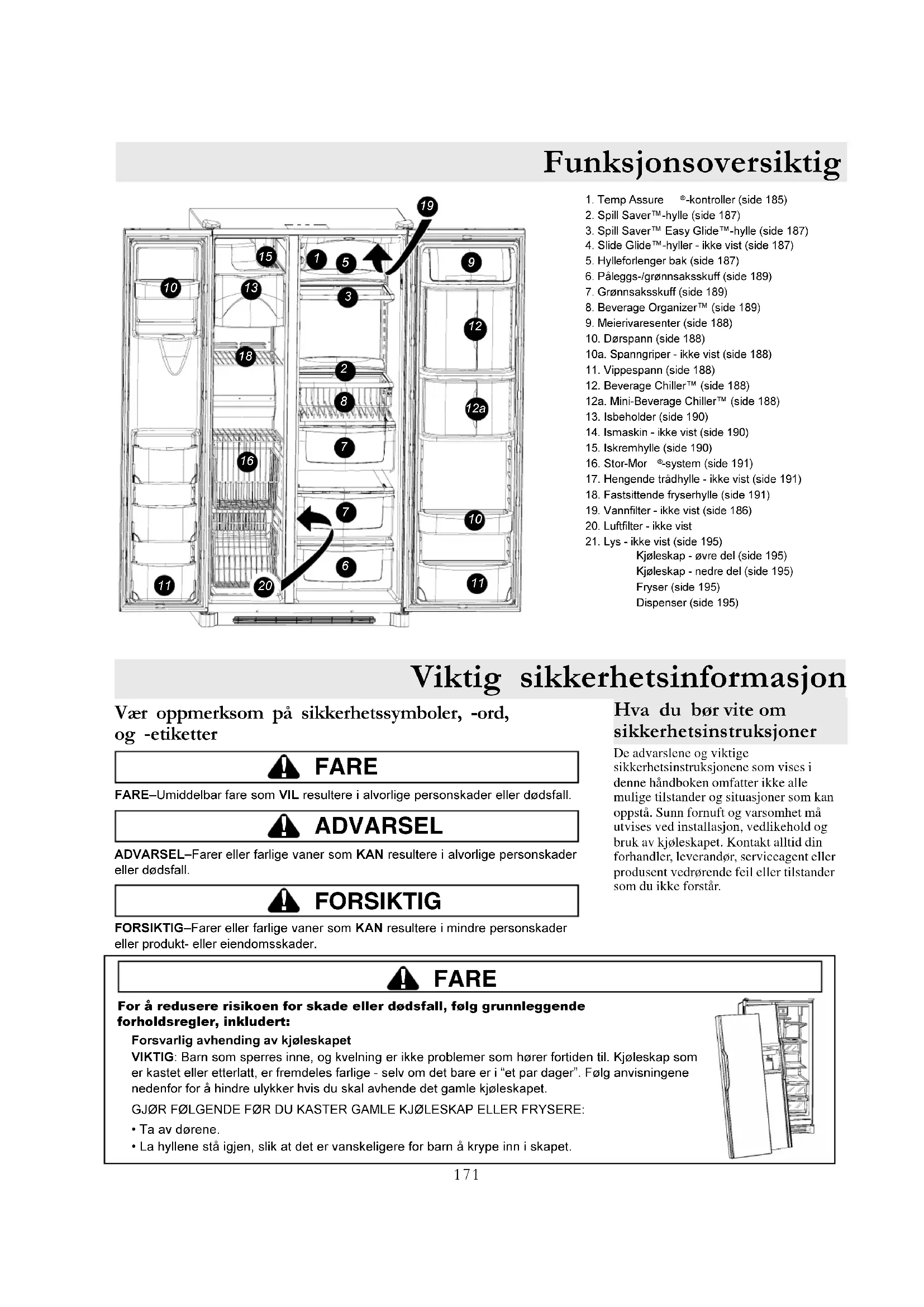FORSIKTIGFarer eller farlige vaner som KAN resultere i mindre personskader eller produkt- eller eiendomsskader.Hva du bør vite omsikkerhetsinstruksjoner De advarslene og viktige sikkerhetsinstruksjonene som vises i denne håndboken omfatter ikke alle mulige tilstander og situasjoner som kan oppstå. Sunn fornuft og varsomhet må utvises ved installasjon, vedlikehold og bruk av kjøleskapet. Kontakt alltid din forhandler, leverandør, serviceagent eller produsent vedrørende feil eller tilstander som du ikke forstår. Forsvarlig avhending av kjøleskapet VIKTIG: Barn som sperres inne, og kvelning er ikke problemer som hører fortiden til. Kjøleskap som er kastet eller etterlatt, er fremdeles farlige - selv om det bare er i et par dager. Følg anvisningenenedenfor for å hindre ulykker hvis du skal avhende det gamle kjøleskapet.GJØR FØLGENDE FØR DU KASTER GAMLE KJØLESKAP ELLER FRYSERE: Ta av dørene. La hyllene stå igjen, slik at det er vanskeligere for barn å krype inn i skapet. FARE