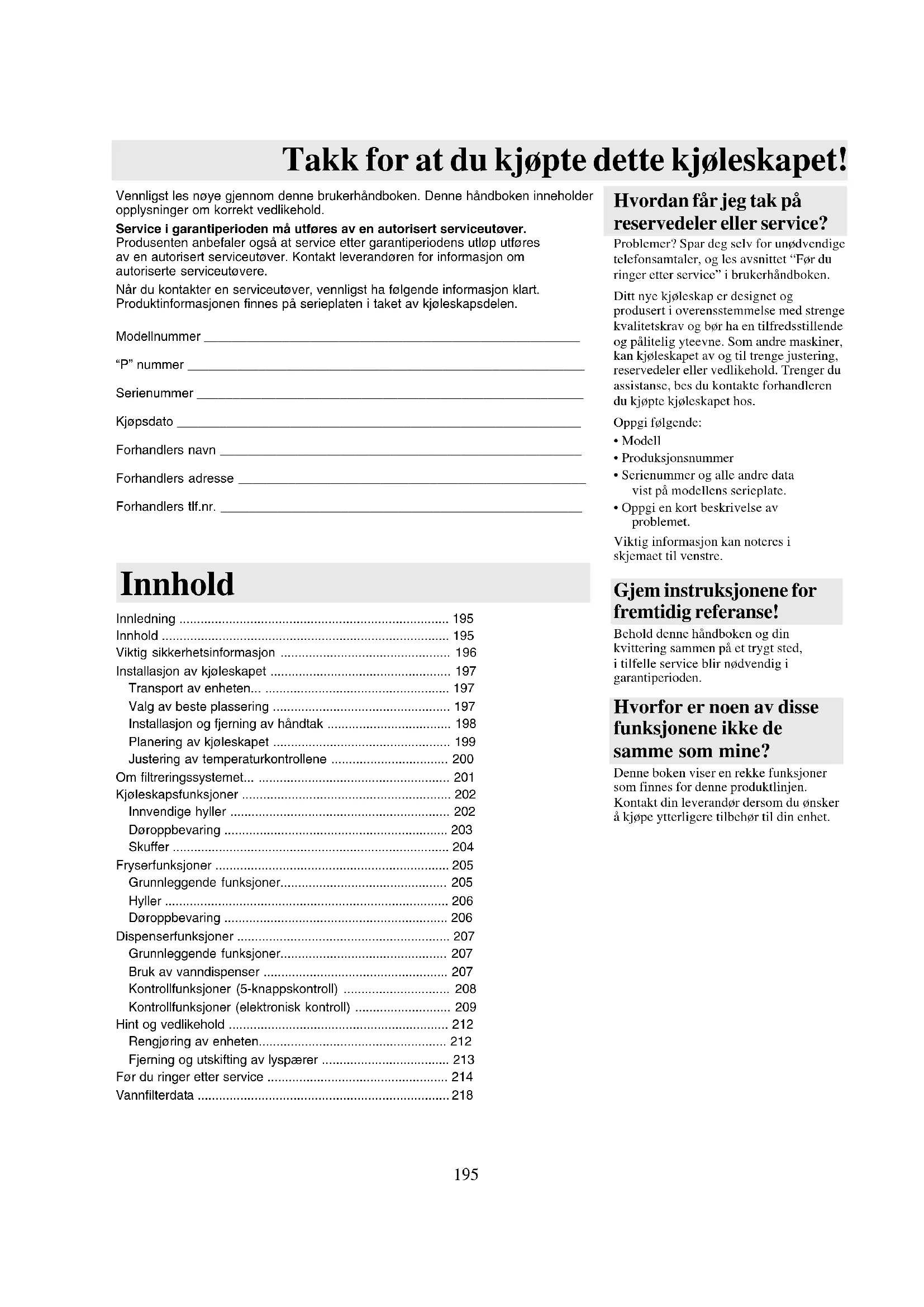 - Vannfilterdata Hvorfor er noen av disse funksjonene ikke de samme som mine? Denne boken viser en rekke funksjoner som finnes for denne produktlinjen. Kontakt din leverandør dersom du ønsker å kjøpe ytterligere tilbehør til din enhet. Hvordan får jeg tak på reservedeler eller service? Problemer? Spar deg selv for unødvendige telefonsamtaler, og les avsnittet “Før du ringer etter service” i brukerhåndboken. Ditt nye kjøleskap er designet og produsert i overensstemmelse med strenge kvalitetskrav og bør ha en tilfredsstillende og pålitelig yteevne. Som andre maskiner, kan kjøleskapet av og til trenge justering, reservedeler eller vedlikehold. Trenger du assistanse, bes du kontakte forhandleren du kjøpte kjøleskapet hos. Oppgi følgende: p. 218