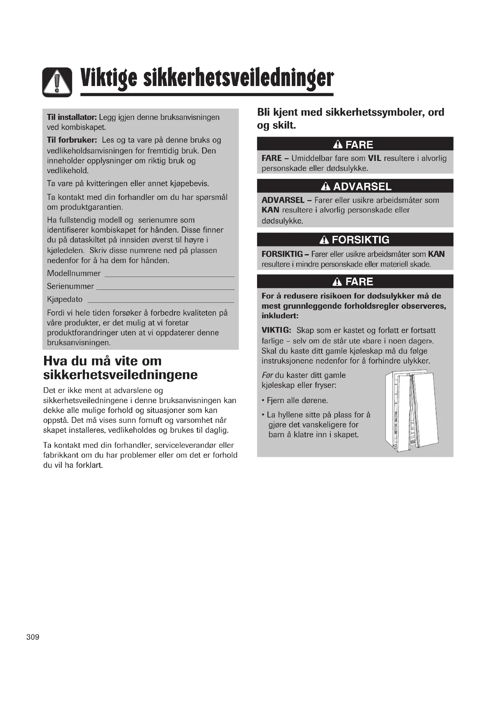 Viktige sikkerhetsveiledninger ADVARSEL – Farer eller usikre arbeidsmåter som KAN resultere i alvorlig personskade eller dødsulykke. ADVARSEL FARE – Umiddelbar fare som VIL resultere i alvorlig personskade eller dødsulykke. FARE FORSIKTIG – Farer eller usikre arbeidsmåter som KAN resultere i mindre personskade eller materiell skade. FORSIKTIG Hva du må vite om sikkerhetsveiledningene Det er ikke ment at advarslene og sikkerhetsveiledningene i denne bruksanvisningen kan dekke alle mulige forhold og situasjoner som kan oppstå. Det må vises sunn fornuft og varsomhet når skapet inst alleres, vedlikeholdes og brukes til daglig. Ta kontakt med din forhandler, serviceleverandør eller fabrikkant om du har problemer eller om det er forhold du vil ha forklart. Til installatør: Legg igjen denne bruksanvisningen ved kombiskapet. Til forbruker: Les og ta vare på denne bruks og vedlikeholdsanvisningen for fremtidig bruk. Den inneholder opplysninger om riktig bruk og vedlikehold. Ta vare på kvitteringen eller annet kjøpebevis. Ta kontakt med din forhandler om du har spørsmål om produktgarantien. Ha fullstendig modell og serienumre som identifiserer kombiskapet for hånden. Disse finner du på dataskiltet på innsiden øverst til høyre i kjøledelen. Skriv disse numrene ned på plassen nedenfor for å ha dem for hånden. Modellnummer
