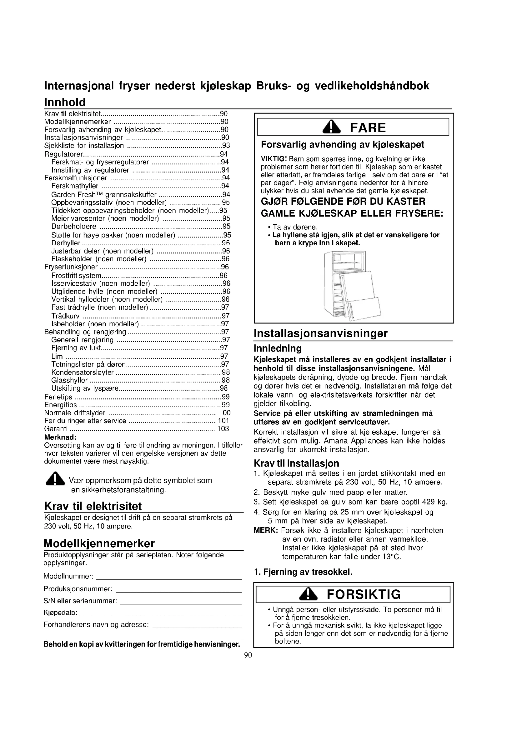 Internasjonal fryser nederst kjoleskap Bruks- og vedlikeholdshandbok Innhold