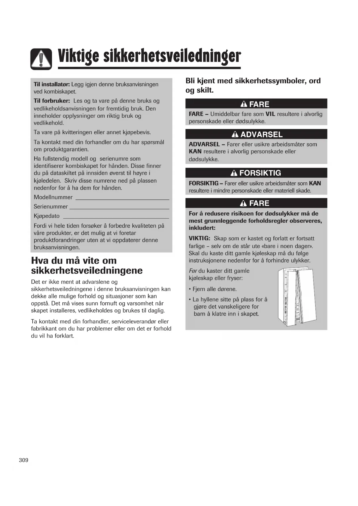 VIKTIG: Skap som er kastet og forlatt er fortsett farlige - selv om de star ute «bare i noen dager'. Skal du kaste ditt gamle kjoleskap ma du folge instruksjonene nedenfor for a forhindre ulykker.