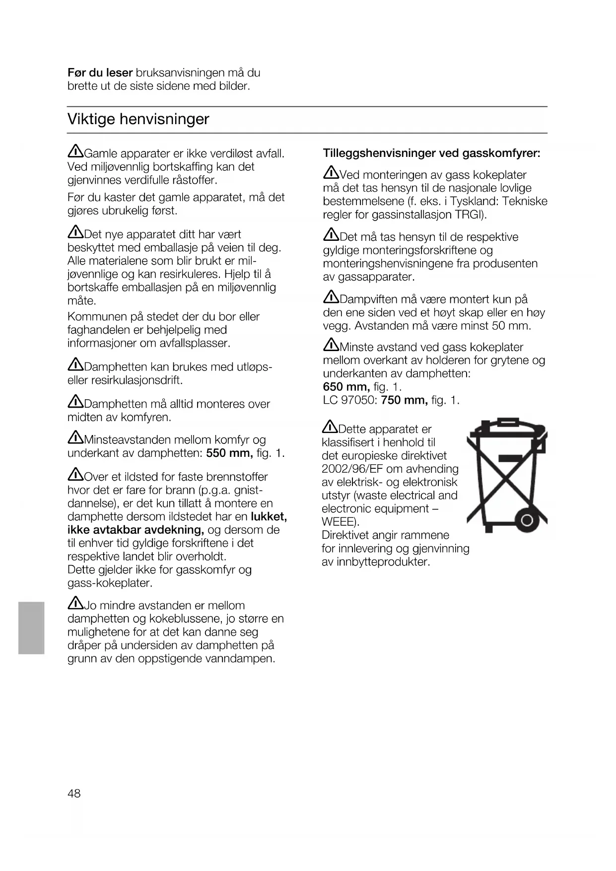 Når damphetten blir drevet med utløpsdrift og det samtidig blir fyrt med apparater som er avhengig av skorstein (som f.eks. gass, olje, kullfyringsapparater, varmtvannsbeholdere med gjennomløp) må det sørges for tilstrekkelig tilførsel av frisk luft. Dette er nødvendig for forbrenningen. En risikofri drift er mulig dersom undertrykket i rommet der ovnen er montert ikke overskrider 4 Pa (0,04 mbar). Utløpsdrift fig. 2 Dette kan oppnås når forbrenningsluften kan få strømme inn enten ved åpninger som ikke kan lukkes, f. eks. dører, vinduer og i forbindelse med murkasse for innstrømning og utstrømning av luft, eller andre tekniske tiltak, bl. a. gjensidig låsing e. l. Dersom ikke det strømmer inn tilstrekkelig luft, er det fare for at forbrenningsgassen kan bli suget tilbake. Kun en murkasse for tilløps- og utløpsluft alene garanterer ikke at grenseverdien blir overholdt. Bemerkning: Ved vurdering av luftfor- holdene må hele leiligheten/huset vurderes under ett. Ved bruk av kokeutstyr, f.eks. gasskomfyr eller gassplater gjelder ikke denne regelen. Dersom damphetten blir drevet med resirkulasjonsluft – med aktivfilter –, er det ingen innskrenkninger når det gjelder driften. Skal avluften ledes gjennom ytter- veggen, bør det brukes en teleskop- murboks.50 Før montasjen Slik oppnår du en optimal ytelse på damphetten: