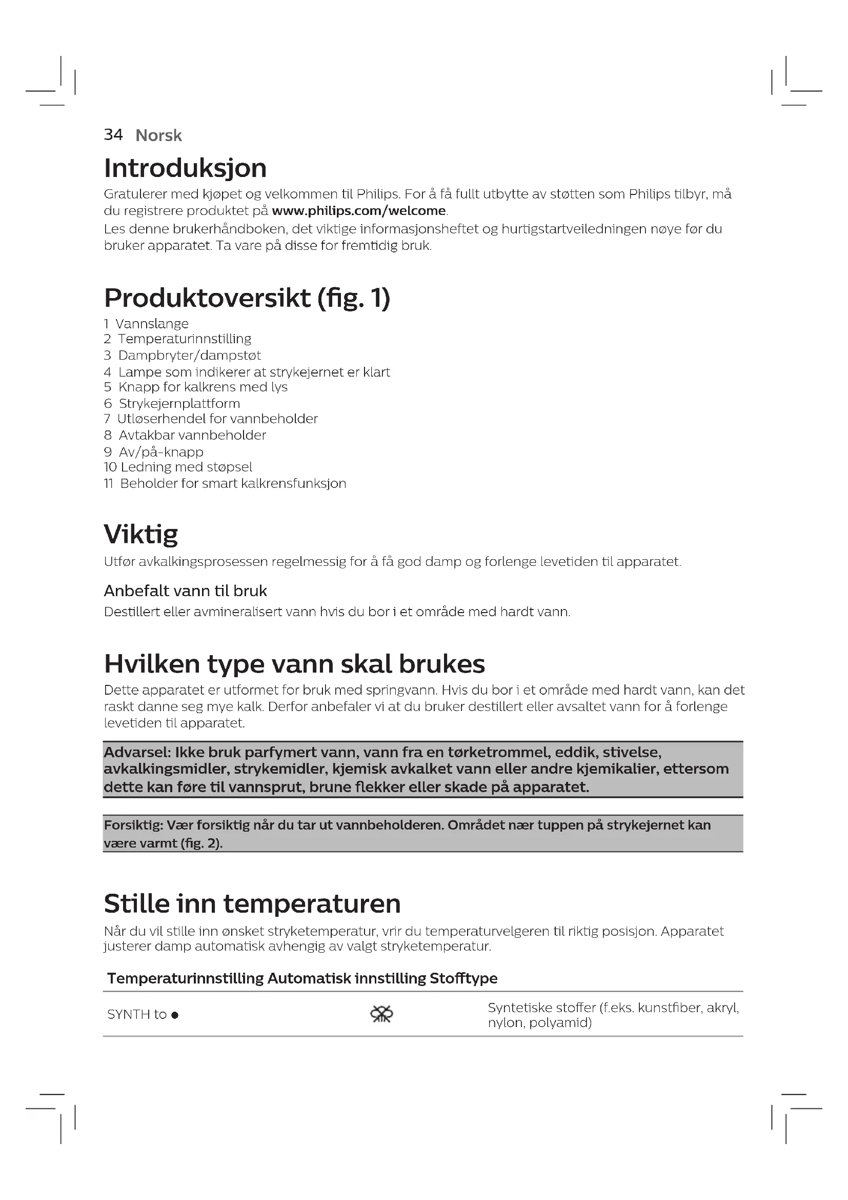 Ull, viskose, polyester og silke 3 to LINEN Bomull, lin Trykk på og hold nede dampbryteren for å starte strykingen. Når du har strøket med damp, bør du stryke de siste gangene uten damp for å få best resultat. Modus for automatisk av-funksjon Enkelte modeller i denne serien har automatisk av-funksjon. - Hvis apparatet ikke har blitt brukt i løpet av fem minutter, slår det seg av automatisk for å spare strøm. Lampen som indikerer at strykejernet er klart, blinker. - Slå av/på-knappen av og deretter på for å aktivere apparatet igjen. Apparatet begynner da å varme opp igjen. Rengjøring og vedlikehold Smart kalkrenssystem Apparatet har blitt utviklet med et smart kalkrenssystem for å sikre at avkalking og rengjøring utføres regelmessig. Dette bidrar til å opprettholde en god dampytelse og forhindrer at smuss og ekker kommer ut av strykesålen over tid. Dampgeneratoren gir regelmessige påminnelser for å sikre at rengjøringen blir utført. Lyd- og lampevarsel for kalkrens Etter én til tre måneders bruk vil kalkrenslampen begynne å blinke og apparatet gi fra seg en pipelyd. Dette indikerer at du må utføre kalkrens (g. 3). Tips: Du kan fortsette å stryke uten damp ved ikke å trykke på dampbryteren. I tillegg til dette har dampgeneratoren en integrert funksjon for beskyttelse mot kalkbelegg: Dampfunksjonen blir deaktivert hvis avkalking ikke har blitt utført. Etter at avkalking er fullført, vil dampstrykefunksjonen gjenopprettes. Dette skjer uavhengig av typen vann som brukes. Merk: Kalkrensfunksjonen kan brukes når som helst, selv når lyd- og lyspåminnelse ikke er aktivert ennå. Utføre kalkrensfunksjonen med beholderen for kalkrens Advarsel: Ikke forlat apparatet uten tilsyn under kalkrensprosessen. Advarsel: Ikke avbryt prosessen ved å løfte strykejernet opp fra beholderen for kalkrens, da det kan komme varmt vann og damp ut av strykesålen. 1 Fyll vannbeholderen halvfull med vann (g. 4). Merk: Pass på at apparatet er koblet til og slått PÅ under kalkrensprosessen. 2 Plasser beholderen for kalkrens på strykebrettet eller en annen jevn og stabil overate. 3 Plasser strykejernet oppå beholderen for kalkrens, og sørg for at det står stabilt (g. 5).36 Norsk Merk: Beholderen for kalkrens er designet til å samle opp kalkpartikler og varmt vann under kalkrensprosessen. Det er helt trygt å sette strykejernet på denne beholderen under hele prosessen. 4 Trykk på og hold inne knappen for kalkrens i to sekunder til du hører korte pip (g. 6). 5 Du vil høre korte pipelyder og en pumpelyd mens kalkrensprosessen pågår (g. 7). 6 Når kalkrensprosessen er fullført, slutter strykejernet å pipe, og kalkrenslampen slutter å blinke (g. 8). 7 Tørk av strykejernet med en klut, og sett det tilbake på basestasjonen (g. 9). 8 Siden beholderen for kalkrens blir varm under kalkrensprosessen, må du vente i ca. fem minutter før du berører den. Deretter tar du beholderen bort til vasken, tømmer den og setter den bort for senere bruk (g. 10). 9 Hvis det er nødvendig, kan du gjenta trinn 1 til 7. Sørg for at beholderen for kalkrens er helt tom før du starter kalkrensprosessen. Merk: Under kalkrensprosessen kan det komme rent vann ut av strykesålen dersom det har samlet seg kalk inne i strykejernet. Dette er normalt. Feilsøking Dette kapittelet oppsummerer de vanligste problemene du kan oppleve med apparatet. Hvis du ikke kan løse problemet ved hjelp av informasjonen nedenfor, kan du gå til www.philips.com/support for å se en liste over vanlige spørsmål, eller du kan kontakte forbrukerstøtten i landet der du bor. Problem Mulig årsak Løsning Strykejernet avgir ikke damp. Du har stilt inn temperaturvelgeren til SYNTH to 1. Vri temperaturbryteren til 2 eller høyere. Dampfunksjonen er deaktivert til du har utført kalkrensprosessen. Utfør kalkrensprosessen for å gjenopprette dampfunksjonen igjen (se avsnittet Rengjøring og vedlikehold). Ved begynnelsen av strykeøkten har ikke dampbryteren vært trykt ned lenge nok. Trykk på og hold nede dampbryteren til det kommer damp ut. Det kan ta opptil 30 sekunder før det kommer damp ut. Kalkrenslampen blinker. Det kommer ingen damp ut av strykesålen, og/ eller apparatet piper. Du har ikke utført eller har ikke fullført kalkrensprosessen. Utfør kalkrensprosessen for å aktivere dampfunksjonen på nytt (se avsnittet "Rengjøring og vedlikehold"). Apparatet er slått av. Den automatiske av- funksjonen aktiveres automatisk når apparatet ikke har vært i bruk på mer enn fem minutter. Slå av/på-knappen av og deretter på for å aktivere apparatet igjen. Apparatet begynner da å varme opp igjen. Apparatet lager en høy pumpelyd. Vannbeholderen er tom. Fyll på vannbeholderen med vann, og trykk på dampbryteren til pumpelyden blir svakere, og det kommer damp ut av strykesålen.37 Norsk Problem Mulig årsak Løsning Det kommer vanndråper ut av strykesålen. Etter kalkrensprosessen kan det dryppe gjenværende vann ut av strykesålen. Tørk av strykesålen med en klut. Hvis kalkrenslampen fremdeles blinker, og apparatet fortsatt piper, må du utføre kalkrensprosessen (se avsnittet Rengjøring og vedlikehold). Det kommer skittent vann og urenheter (brune ekker, hvite ak osv.) ut av strykesålen. Urenheter eller kjemikalier i vannet har avleiret seg i dampventilene og/eller på strykesålen. Sørg for å utføre kalkrensprosessen regelmessig (se avsnittet Rengjøring og vedlikehold). Det renner vann ut av strykesålen. Du har startet kalkrensprosessen ved et uhell (se avsnittet Rengjøring og vedlikehold). Slå av apparatet. Slå den deretter på igjen. La strykejernet varmes opp til lampen som indikerer at strykejernet er klart, lyser vedvarende.38 Português Introdução Parabéns pela sua compra e seja bem-vindo à Philips! Para beneciar na totalidade da assistência que a Philips oferece, registe o seu produto em www.philips.com/welcome. Leia atentamente este manual do utilizador, o folheto informativo importa