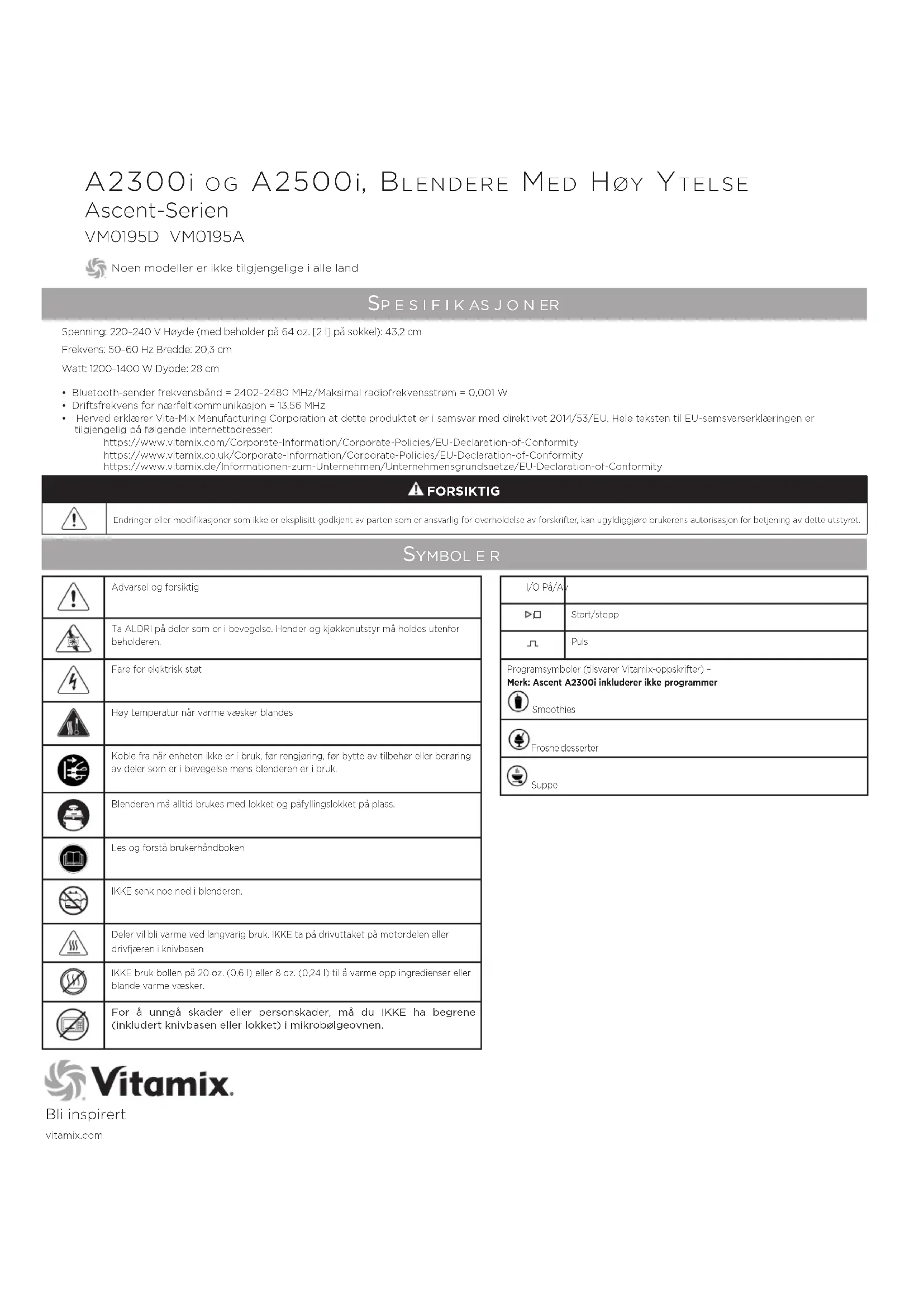 Finn enhetens veiledning gratis Ascent A2500i Vitamix i PDF-format.