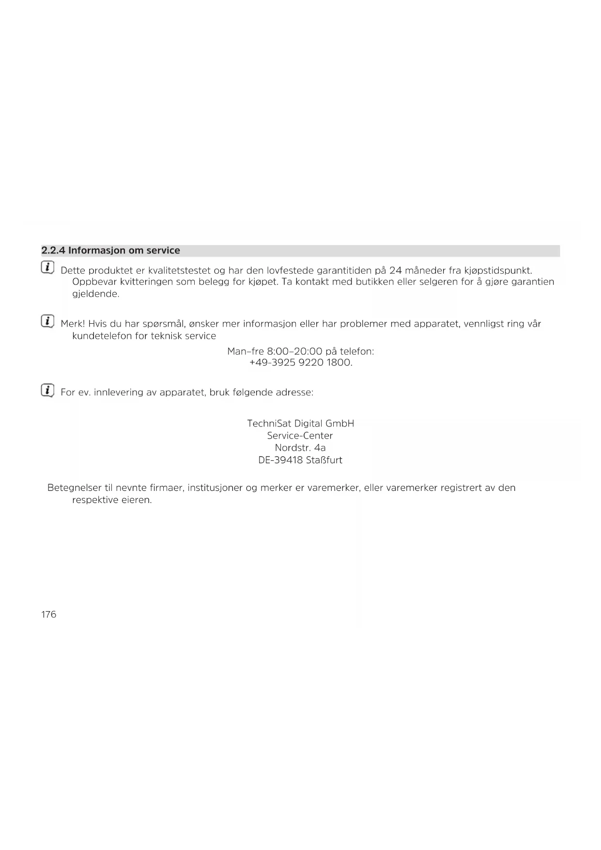 Dette produktet er kvalitetstestet og har den lovfestede garantitiden på 24 måneder fra kjøpstidspunkt. Oppbevar kvitteringen som belegg for kjøpet. Ta kontakt med butikken eller selgeren for å gjøre garantien gjeldende. Merk! Hvis du har spørsmål, ønsker mer informasjon eller har problemer med apparatet, vennligst ring vår kundetelefon for teknisk service Man–fre 8:00–20:00 på telefon: +49-3925 9220 1800. For ev. innlevering av apparatet, bruk følgende adresse: TechniSat Digital GmbH Service-Center Nordstr. 4a DE-39418 Staßfurt Betegnelser til nevnte firmaer, institusjoner og merker er varemerker, eller varemerker registrert av den respektive eieren.177