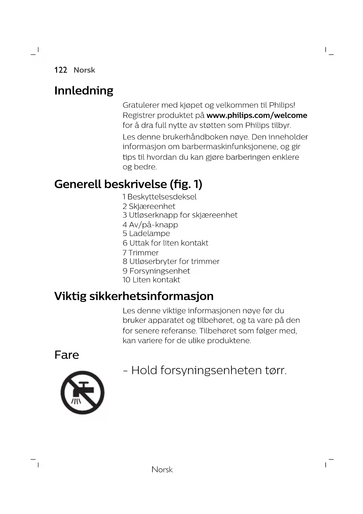 NederlandsNorsk Innledning Gratulerer med kjøpet og velkommen til Philips! Registrer produktet på www.philips.com/welcome for å dra full nytte av støtten som Philips tilbyr. Les denne brukerhåndboken nøye. Den inneholder informasjon om barbermaskinfunksjonene, og gir tips til hvordan du kan gjøre barberingen enklere og bedre. Generell beskrivelse (fig. 1) 1 Beskyttelsesdeksel 2 Skjæreenhet 3 Utløserknapp for skjæreenhet 4 Av/på-knapp 5 Ladelampe 6 Uttak for liten kontakt 7 Trimmer 8 Utløserbryter for trimmer 9 Forsyningsenhet 10 Liten kontakt Viktig sikkerhetsinformasjon Les denne viktige informasjonen nøye før du bruker apparatet og tilbehøret, og ta vare på den for senere referanse. Tilbehøret som følger med, kan variere for de ulike produktene. Fare - Hold forsyningsenheten tørr.