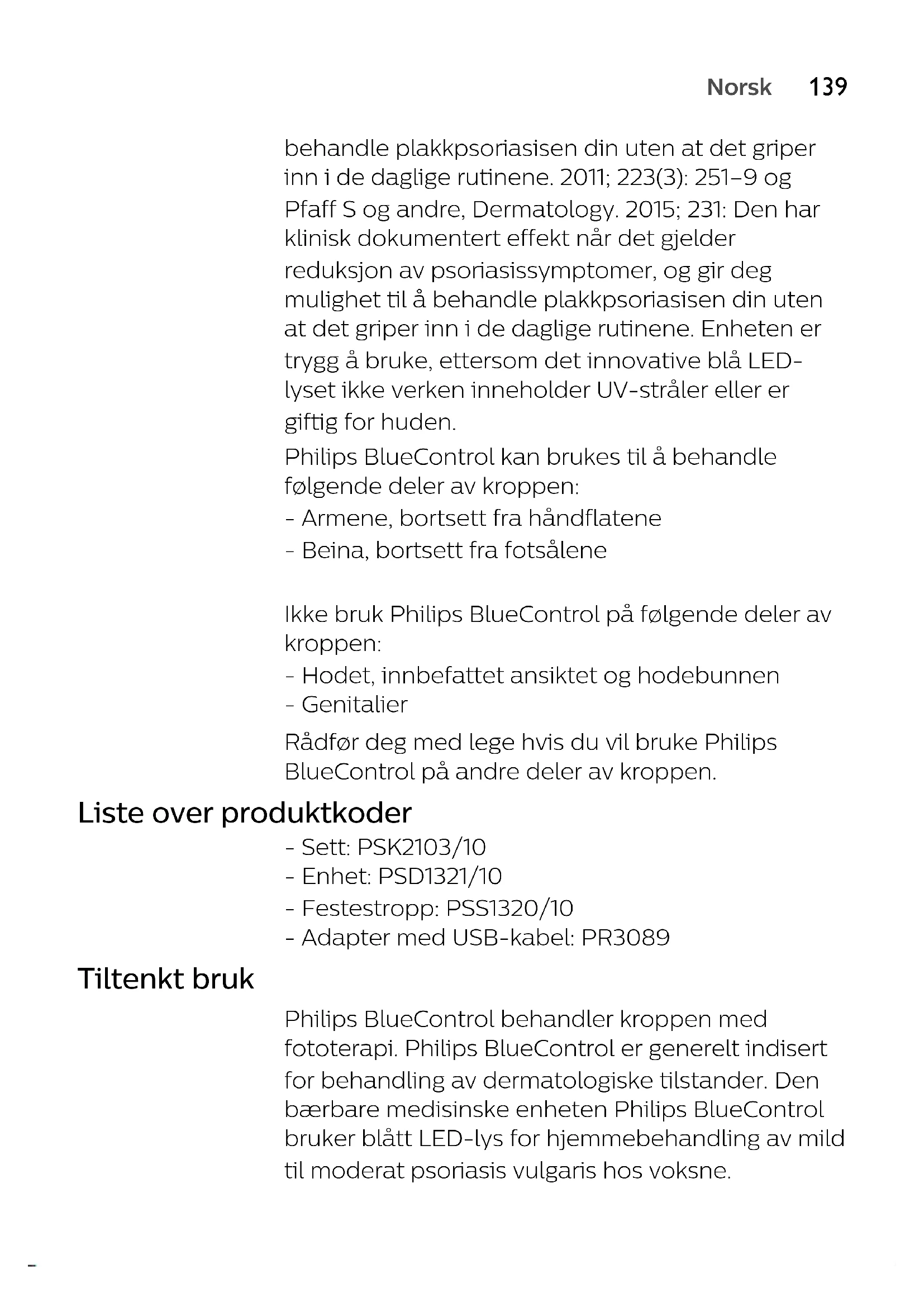 Norskbehandle plakkpsoriasisen din uten at det griper inn i de daglige rutinene. 2011; 223(3): 251–9 og Pfaff S og andre, Dermatology. 2015; 231: Den har klinisk dokumentert effekt når det gjelder reduksjon av psoriasissymptomer, og gir deg mulighet til å behandle plakkpsoriasisen din uten at det griper inn i de daglige rutinene. Enheten er trygg å bruke, ettersom det innovative blå LED- lyset ikke verken inneholder UV-stråler eller er giftig for huden. Philips BlueControl kan brukes til å behandle følgende deler av kroppen: - Armene, bortsett fra håndflatene - Beina, bortsett fra fotsålene Ikke bruk Philips BlueControl på følgende deler av kroppen: - Hodet, innbefattet ansiktet og hodebunnen - Genitalier Rådfør deg med lege hvis du vil bruke Philips BlueControl på andre deler av kroppen. Liste over produktkoder - Sett: PSK2103/10 - Enhet: PSD1321/10 - Festestropp: PSS1320/10 - Adapter med USB-kabel: PR3089 Tiltenkt bruk Philips BlueControl behandler kroppen med fototerapi. Philips BlueControl er generelt indisert for behandling av dermatologiske tilstander. Den bærbare medisinske enheten Philips BlueControl bruker blått LED-lys for hjemmebehandling av mild til moderat psoriasis vulgaris hos voksne.