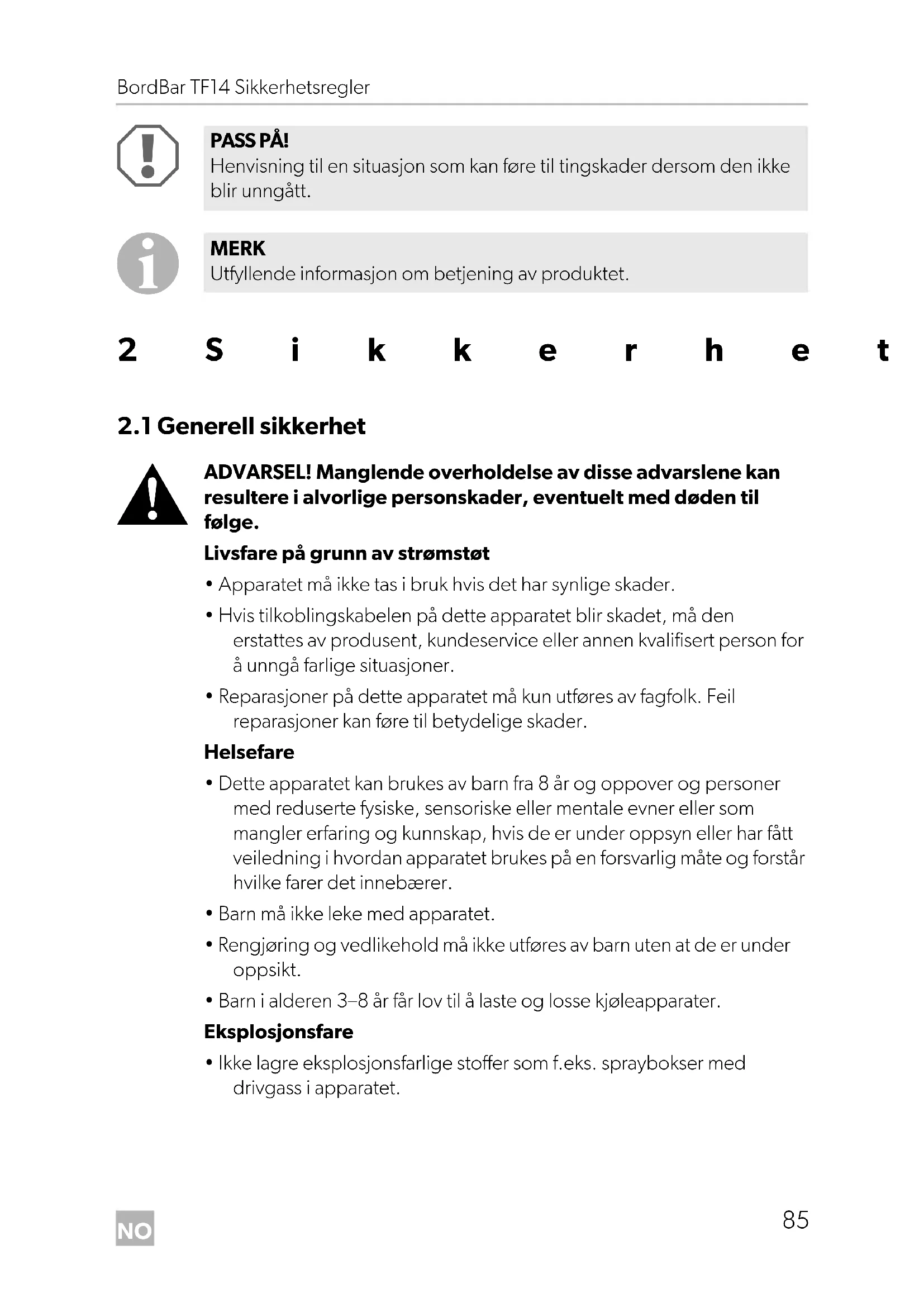 - Ikke plasser flere mobile strømkontakter eller mobile strøm- forsyninger bak på apparatet. FORSIKTIG! Helsefare! Næringsmidler må oppbevares i originalforpakning eller i egnede beholdere. PASS PÅ!
