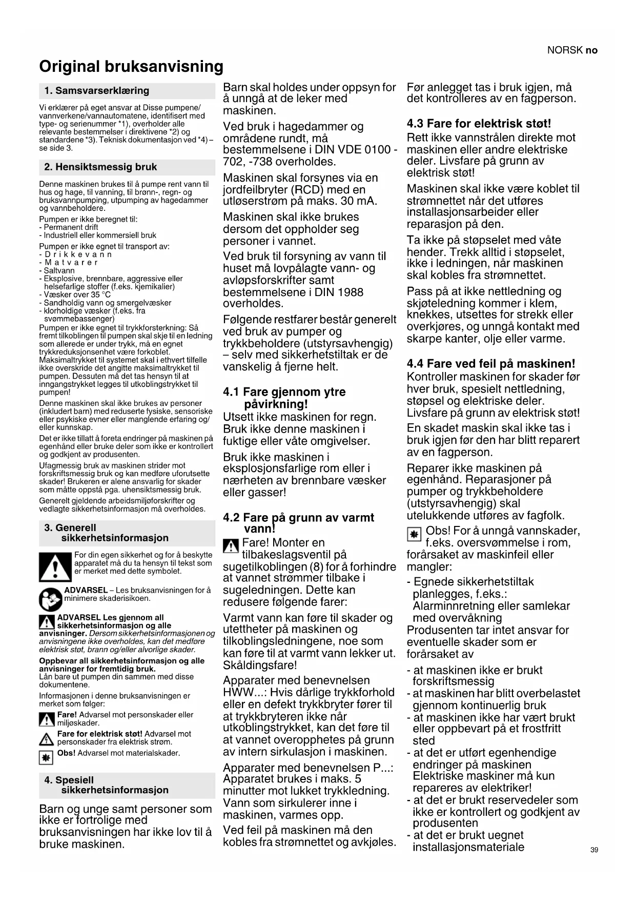 Original bruksanvisning Vi erklærer på eget ansvar at Disse pumpene/ vannverkene/vannautomatene, identifisert med type- og serienummer *1), overholder alle relevante bestemmelser i direktivene *2) og standardene *3). Teknisk dokumentasjon ved *4) – se side 3. Denne maskinen brukes til å pumpe rent vann til hus og hage, til vanning, til brønn-, regn- og bruksvannpumping, utpumping av hagedammer og vannbeholdere. Pumpen er ikke beregnet til: - Permanent drift - Industriell eller kommersiell bruk Pumpen er ikke egnet til transport av: -Drikkevann -Matvarer - Saltvann - Eksplosive, brennbare, aggressive eller helsefarlige stoffer (f.eks. kjemikalier) - Væsker over 35 °C - Sandholdig vann og smergelvæsker - klorholdige væsker (f.eks. fra svømmebassenger) Pumpen er ikke egnet til trykkforsterkning: Så fremt tilkoblingen til pumpen skal skje til en ledning som allerede er under trykk, må en egnet trykkreduksjonsenhet være forkoblet. Maksimaltrykket til systemet skal i ethvert tilfelle ikke overskride det angitte maksimaltrykket til pumpen. Dessuten må det tas hensyn til at inngangstrykket legges til utkoblingstrykket til pumpen! Denne maskinen skal ikke brukes av personer (inkludert barn) med reduserte fysiske, sensoriske eller psykiske evner eller manglende erfaring og/ eller kunnskap. Det er ikke tillatt å foreta endringer på maskinen på egenhånd eller bruke deler som ikke er kontrollert og godkjent av produsenten. Ufagmessig bruk av maskinen strider mot forskriftsmessig bruk og kan medføre uforutsette skader! Brukeren er alene ansvarlig for skader som måtte oppstå pga. uhensiktsmessig bruk. Generelt gjeldende arbeidsmiljøforskrifter og vedlagte sikkerhetsinformasjon må overholdes. For din egen sikkerhet og for å beskytte apparatet må du ta hensyn til tekst som er merket med dette symbolet. ADVARSEL – Les bruksanvisningen for å minimere skaderisikoen. ADVARSEL Les gjennom all sikkerhetsinformasjon og alle anvisninger. Dersom sikkerhetsinformasjonen og anvisningene ikke overholdes, kan det medføre elektrisk støt, brann og/eller alvorlige skader. Oppbevar all sikkerhetsinformasjon og alle anvisninger for fremtidig bruk. Lån bare ut pumpen din sammen med disse dokumentene. Informasjonen i denne bruksanvisningen er merket som følger: Fare! Advarsel mot personskader eller miljøskader. Fare for elektrisk støt! Advarsel mot personskader fra elektrisk strøm. Obs! Advarsel mot materialskader. Barn og unge samt personer som ikke er fortrolige med bruksanvisningen har ikke lov til å bruke maskinen. Barn skal holdes under oppsyn for å unngå at de leker med maskinen. Ved bruk i hagedammer og områdene rundt, må bestemmelsene i DIN VDE 0100 - 702, -738 overholdes. Maskinen skal forsynes via en jordfeilbryter (RCD) med en utløserstrøm på maks. 30 mA. Maskinen skal ikke brukes dersom det oppholder seg personer i vannet. Ved bruk til forsyning av vann til huset må lovpålagte vann- og avløpsforskrifter samt bestemmelsene i DIN 1988 overholdes. Følgende restfarer består generelt ved bruk av pumper og trykkbeholdere (utstyrsavhengig) – selv med sikkerhetstiltak er de vanskelig å fjerne helt.