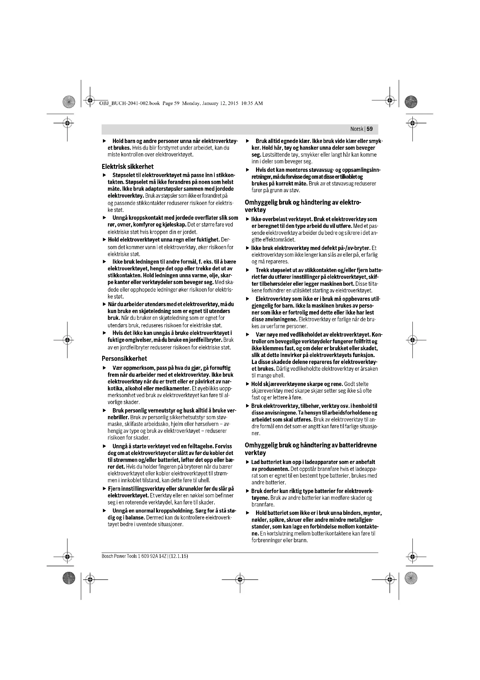 og ved lagring (** Redusert ytelse ved temperatur <0 °C) Anbefalte batterier Anbefalte ladere Symbol Betydning OBJ_BUCH-2041-002.book Page 61 Monday, January 12, 2015 10:35 AM62 | Norsk 1 609 92A 14Z | (12.1.15) Bosch Power Tools Robert Bosch GmbH, Power Tools Division 70764 Leinfelden-Echterdingen, GERMANY Leinfelden, 12.01.2015 Støy-/vibrasjonsinformasjon Måleverdiene til produktet er angitt i tabellen på side 203. Støyutslippsverdier målt i henhold til EN 60745-2-1. Totale svingningsverdier a