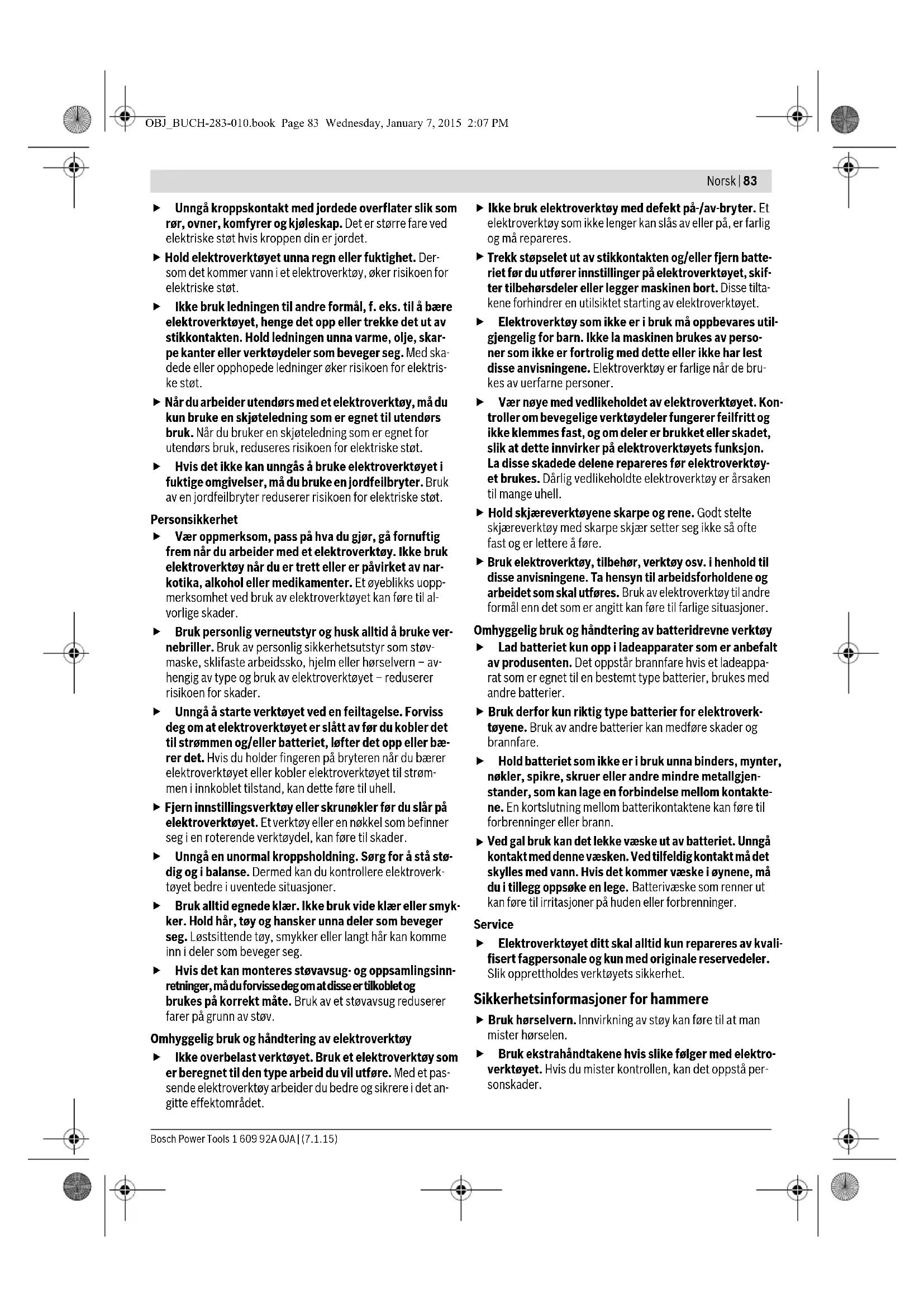 OBJ_BUCH-283-010.book Page 84 Wednesday, January 7, 2015 2:07 PMNorsk | 85 Bosch Power Tools 1 609 92A 0JA | (7.1.15) Vibrasjonsnivået som er angitt i disse anvisningene, er målt iht. en målemetode som er standardisert i EN 60745 og kan brukes til sammenligning av elektroverktøy med hverandre. Det egner seg også til en foreløpig vurdering av vibrasjonsbe- lastningen. Det angitte vibrasjonsnivået representerer de hovedsakelige anvendelsene til elektroverktøyet. Men hvis elektroverktøyet brukes til andre anvendelser, med forskjellig tilbehør eller utilstrekkelig vedlikehold, kan vibrasjonsnivået avvike. Dette kan føre til en tydelig øking av vibrasjonsbelastningen over he- le arbeidstidsrommet. Til en nøyaktig vurdering av vibrasjonsbelastningen skal det også tas hensyn til de tidene maskinen er slått av eller går, men ikke virkelig brukes. Dette kan tydelig redusere vibra- sjonsbelastningen over hele arbeidstidsrommet. Bestem ekstra sikkerhetstiltak til beskyttelse av brukeren mot vibrasjonenes virkning, som for eksempel: Vedlikehold av elektroverktøy og innsatsverktøy, holde hendene varme, or- ganisere arbeidsforløpene. Samsvarserklæring Vi erklærer under eneansvar at produktet som er beskrevet under «Tekniske data» er i overensstemmelse med alle rele- vante bestemmelser i direktivene 2009/125/EC (forordning 1194/2012), 2011/65/EU, 2004/108/EC, 2006/42/EC inkludert endringer, og følgende standarder: EN 60745-1, EN 60745-2-6. Tekniske data (2006/42/EC) hos: Robert Bosch GmbH, PT/ETM9, 70764 Leinfelden-Echterdingen, GERMANY Robert Bosch GmbH, Power Tools Division 70764 Leinfelden-Echterdingen, GERMANY Leinfelden, 07.01.2015 Tekniske data Henk Becker Executive Vice President Engineering Helmut Heinzelmann Head of Product Certification PT/ETM9 Borhammer GBH 36 V-LI Plus GBH 36 VF-LI Plus Produktnummer 3 611 J06 0.. 3 611 J07 0.. Turtallstyring