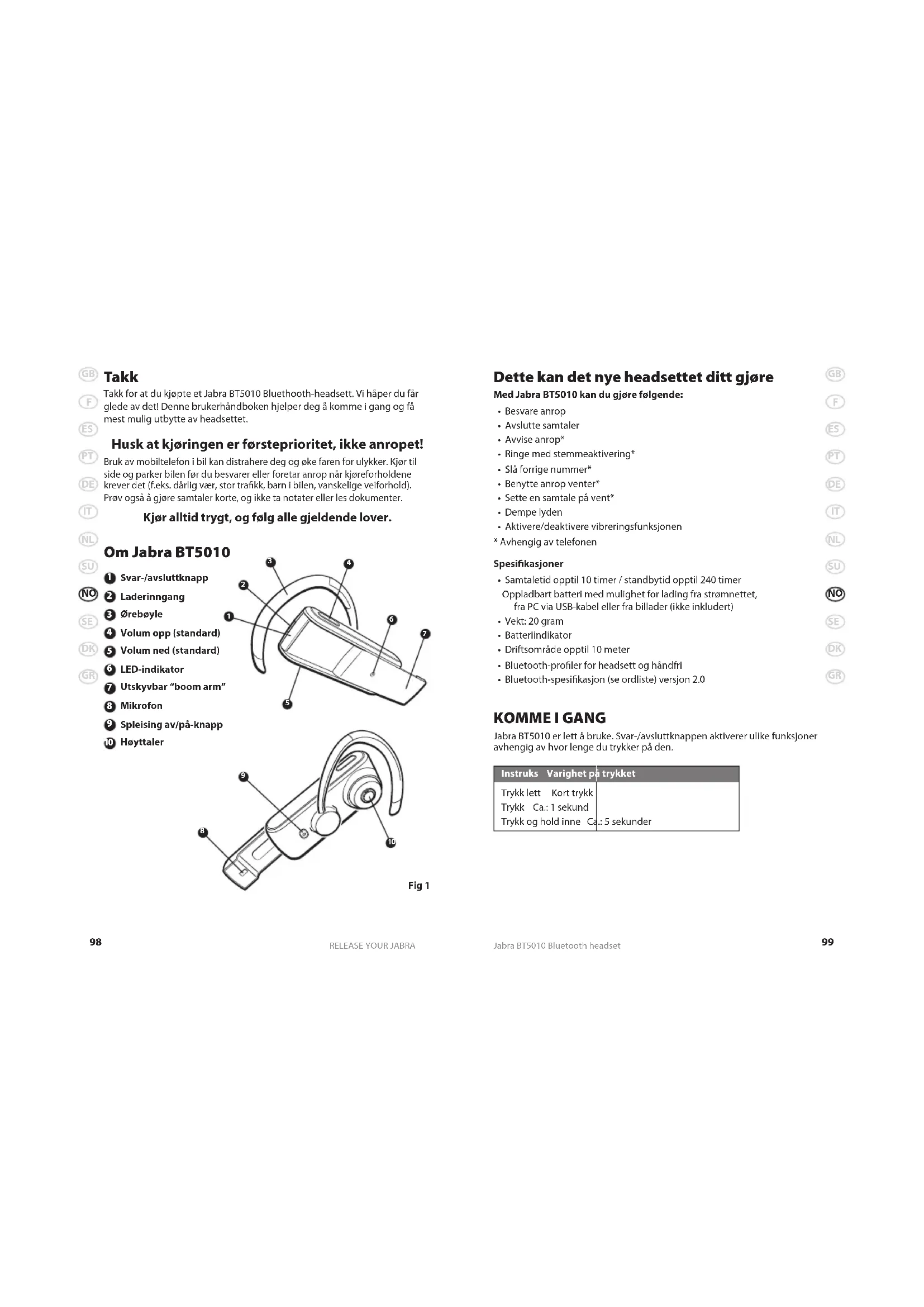 Jabra BT5010 er lett å bruke. Svar-/avsluttknappen aktiverer ulike funksjoner avhengig av hvor lenge du trykker på den. Instruks Varighet på trykket Trykk lett Kort trykk Trykk Ca.: 1 sekund Trykk og hold inne Ca.: 5 sekunder Takk Takk for at du kjøpte et Jabra BT5010 Bluethooth-headsett. Vi håper du får glede av det! Denne brukerhåndboken hjelper deg å komme i gang og få mest mulig utbytte av headsettet. Husk at kjøringen er førsteprioritet, ikke anropet! Bruk av mobiltelefon i bil kan distrahere deg og øke faren for ulykker. Kjør til side og parker bilen før du besvarer eller foretar anrop når kjøreforholdene krever det (f.eks. dårlig vær, stor trakk, barn i bilen, vanskelige veiforhold). Prøv også å gjøre samtaler korte, og ikke ta notater eller les dokumenter. Kjør alltid trygt, og følg alle gjeldende lover. Om Jabra BT5010