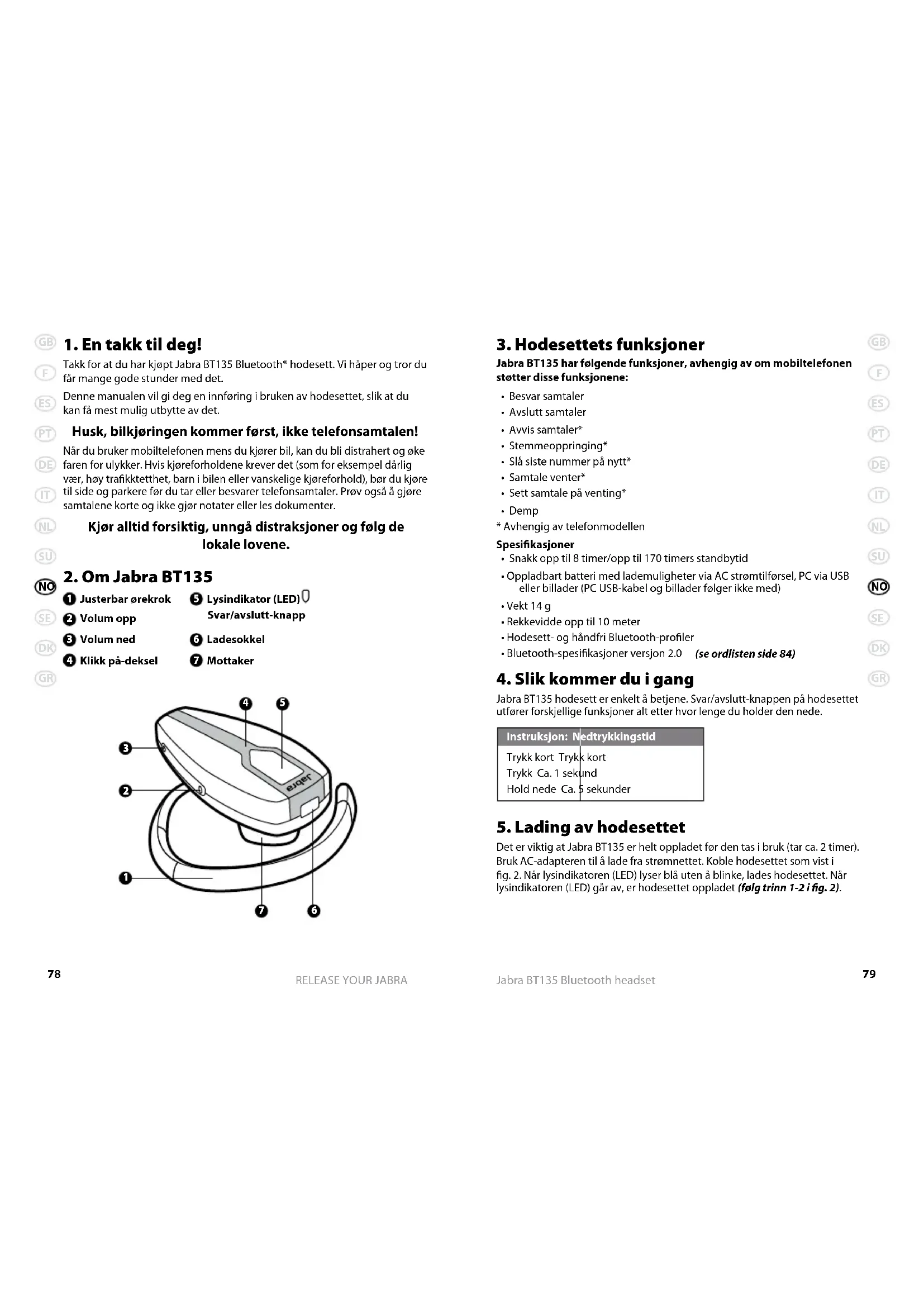 Takk for at du har kjøpt Jabra BT135 Bluetooth® hodesett. Vi håper og tror du får mange gode stunder med det. Denne manualen vil gi deg en innføring i bruken av hodesettet, slik at du kan få mest mulig utbytte av det. Husk, bilkjøringen kommer først, ikke telefonsamtalen! Når du bruker mobiltelefonen mens du kjører bil, kan du bli distrahert og øke faren for ulykker. Hvis kjøreforholdene krever det (som for eksempel dårlig vær, høy trakktetthet, barn i bilen eller vanskelige kjøreforhold), bør du kjøre til side og parkere før du tar eller besvarer telefonsamtaler. Prøv også å gjøre samtalene korte og ikke gjør notater eller les dokumenter. Kjør alltid forsiktig, unngå distraksjoner og følg de lokale lovene.