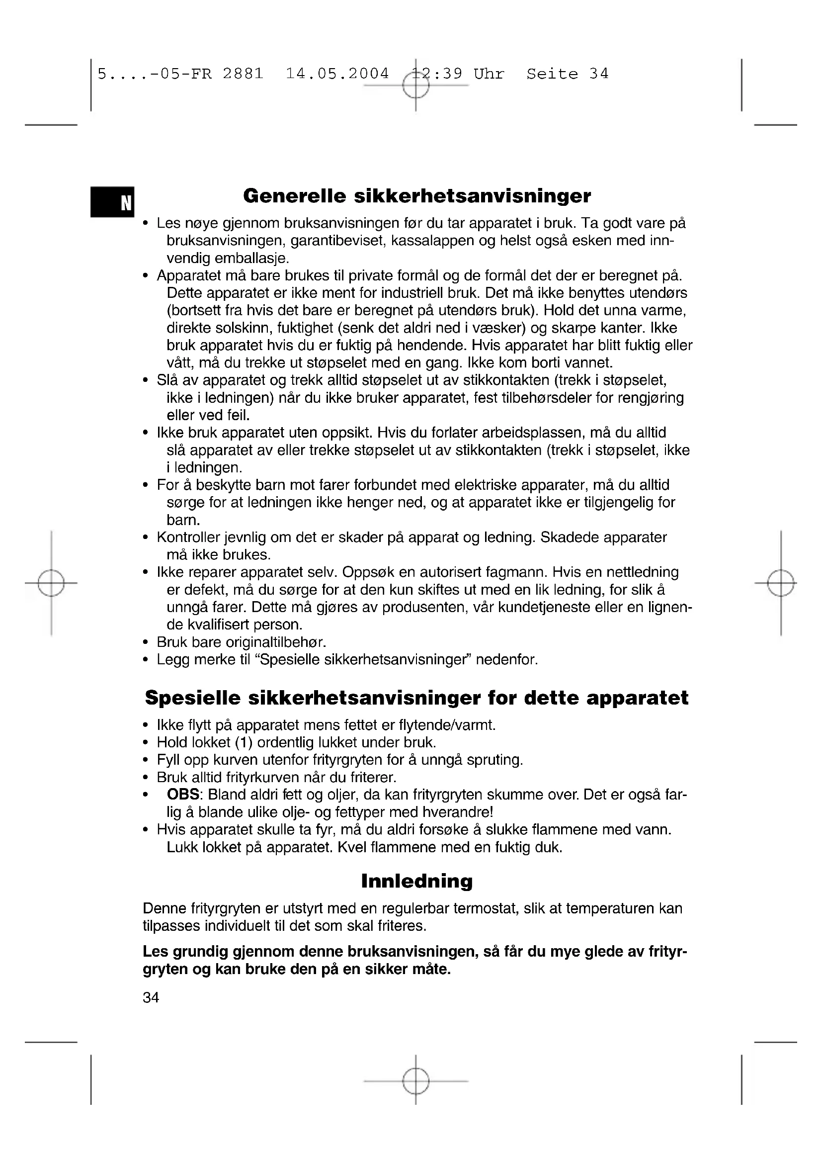 lokket og trekker dekselet ut forover. Dette apparatet har blitt testet i henhold til alle aktuelle CE-retningslinjer som det rammes av, f.eks. elektromagnetisk toleranse og direktiver om lavspenning. Det er laget i henhold til dagens nyeste sikkerhetstekniske forskrifter. Med forbehold om tekniske endringer! Garanti For apparat som vi har solgt, påtar vi oss en garanti på 24 måneder fra kjøpsdato (kassalapp). Innenfor garantitiden fjerner vi mangler på apparat eller tilbehør*) uten omkostnin- ger hvis manglene skyldes material- eller produksjonsfeil. Dette gjør vi ved reparasj- on eller – etter vår vurdering – bytting. Garantiytelser medfører ingen forlengelse av garantitiden, og det oppstår heller ikke noe krav på en ny garanti på grunn av dette! Som garantibevis gjelder kjøpsbeviset. Uten dette beviset kan du ikke få byttet eller reparert apparatet gratis. I forbindelse med garanti ber vi om at du gir hele apparatet i originalemballasjen sammen med kassalappen til din forhandler. *) Skader på tilbehørsdeler fører ikke automatisk til at du får byttet hele apparatet gratis. I slike tilfeller ber vi deg om å henvende deg til vår hotline! Glasskader eller sprekker i plastdeler er i prinsippet kostnadspliktige! Verken defekter på forbrukstilbehør og slitasjedeler (for eksempel motorkull, eltekro- ker, drivremmer, ekstra fjernbetjening, ekstra tannbørster, sagblader osv.) eller rengjøring, vedlikehold og utskifting av slitasjedeler går inn under garantien. Slike ting er derfor kostnadspliktige! Garantien utgår ved inngrep utenfra. Etter garantien Etter at garantitiden har gått ut, kan reparasjoner utføres av den aktuelle faghande- len eller reparasjonsservice mot betaling. 5....-05-FR 2881 14.05.2004 12:39 Uhr Seite 37General Safety Instructions