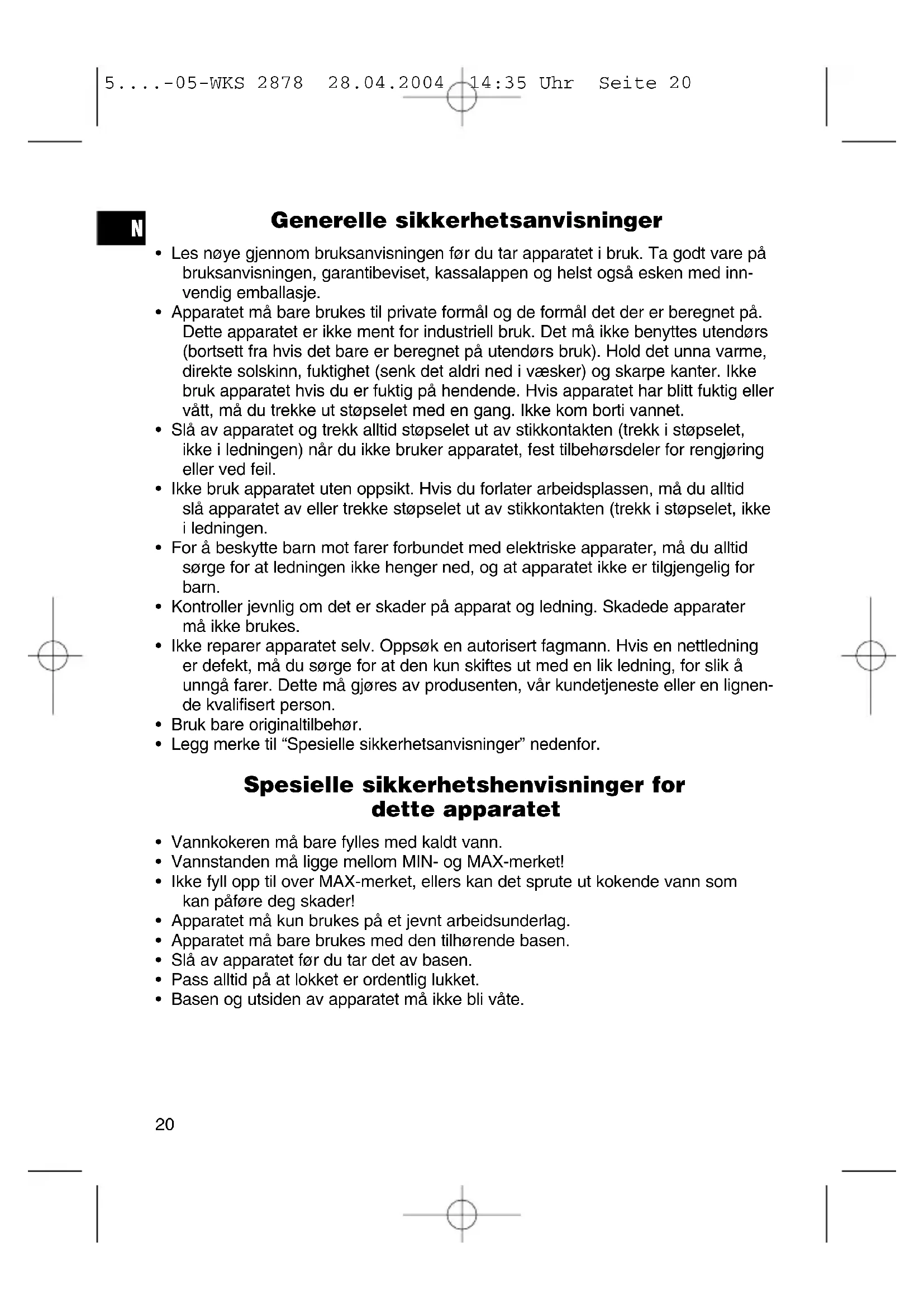 - Kalkfilteret kan tas ut for rengjøring. Trekk da filteret opp etter fliken. Nå kan du fjerne kalkrester fra filteret mens du holder det under rennende vann. Avkalking Hvor ofte apparatet må avkalkes, er avhengig av hvor hardt vannet er, og hvor ofte apparatet er i bruk. Hvis apparatet slår seg av før vannet koker, må det avkalkes tidligere. Ikke bruk eddik, men et vanlig avkalkingsmiddel på sitronsyrebasis. Doser ifølge bruksanvisningen. Dette apparatet har blitt testet i henhold til alle aktuelle CE-retningslinjer som det rammes av, f.eks. elektromagnetisk toleranse og direktiver om lavspenning. Det er laget i henhold til dagens nyeste sikkerhetstekniske forskrifter. Med forbehold om tekniske endringer! 5....-05-WKS 2878 28.04.2004 14:35 Uhr Seite 21Garanti For apparat som vi har solgt, påtar vi oss en garanti på 24 måneder fra kjøpsdato (kassalapp). Innenfor garantitiden fjerner vi mangler på apparat eller tilbehør*) uten omkostnin- ger hvis manglene skyldes material- eller produksjonsfeil. Dette gjør vi ved reparasj- on eller – etter vår vurdering – bytting. Garantiytelser medfører ingen forlengelse av garantitiden, og det oppstår heller ikke noe krav på en ny garanti på grunn av dette! Som garantibevis gjelder kjøpsbeviset. Uten dette beviset kan du ikke få byttet eller reparert apparatet gratis. I forbindelse med garanti ber vi om at du gir hele apparatet i originalemballasjen sammen med kassalappen til din forhandler. *) Skader på tilbehørsdeler fører ikke automatisk til at du får byttet hele apparatet gratis. I slike tilfeller ber vi deg om å henvende deg til vår hotline! Glasskader eller sprekker i plastdeler er i prinsippet kostnadspliktige! Verken defekter på forbrukstilbehør og slitasjedeler (for eksempel motorkull, eltekro- ker, drivremmer, ekstra fjernbetjening, ekstra tannbørster, sagblader osv.) eller rengjøring, vedlikehold og utskifting av slitasjedeler går inn under garantien. Slike ting er derfor kostnadspliktige! Garantien utgår ved inngrep utenfra. Etter garantien Etter at garantitiden har gått ut, kan reparasjoner utføres av den aktuelle faghande- len eller reparasjonsservice mot betaling.