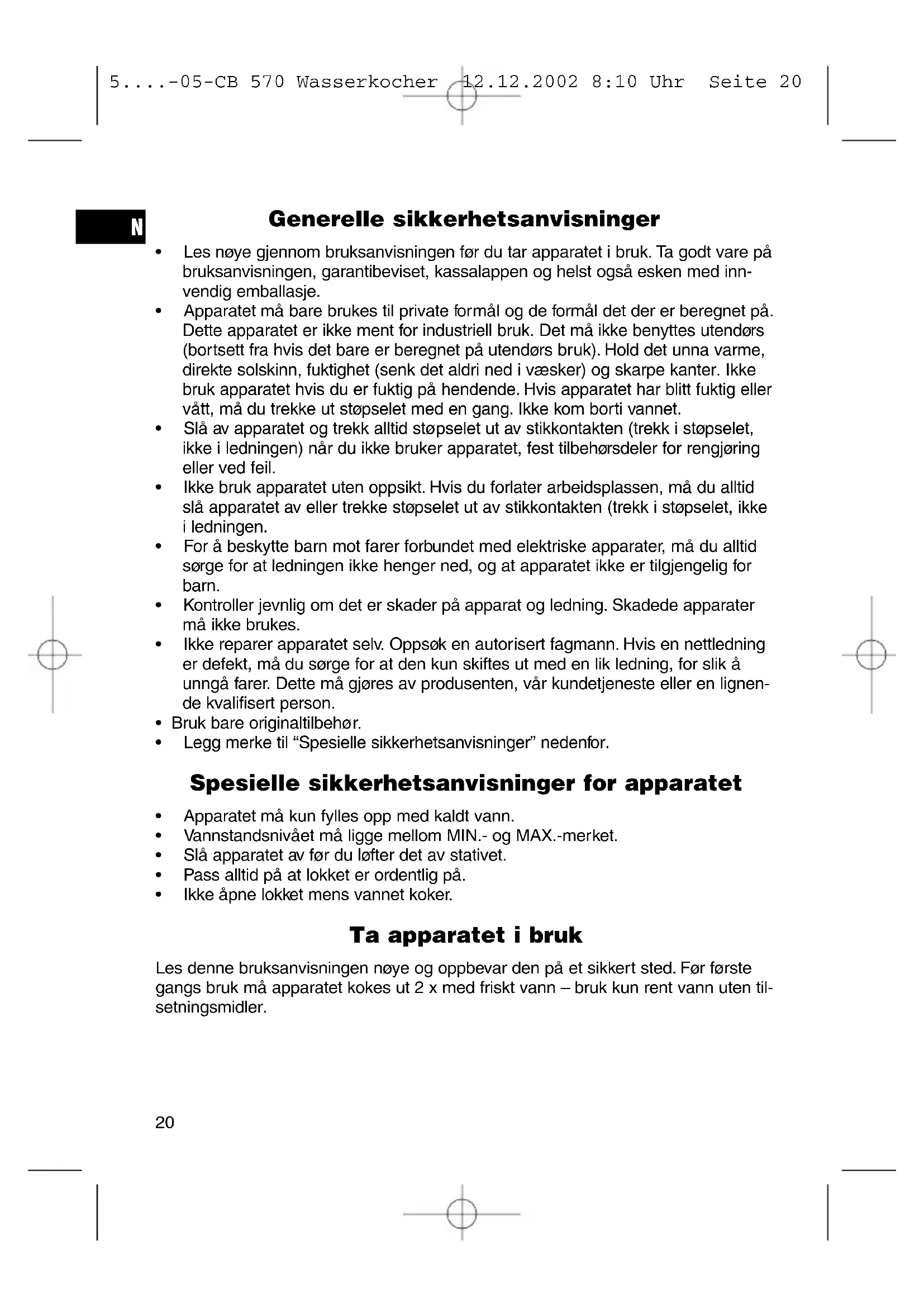 - Apparatet må bare brukes til private formål og de formål det der er beregnet på. Dette apparatet er ikke ment for industriell bruk. Det må ikke benyttes utendørs (bortsett fra hvis det bare er beregnet på utendørs bruk). Hold det unna varme, direkte solskinn, fuktighet (senk det aldri ned i væsker) og skarpe kanter. Ikke bruk apparatet hvis du er fuktig på hendende. Hvis apparatet har blitt fuktig ell er vätt, mä du trekke ut stopselet med en gang. Ikke kom borti vannet.
