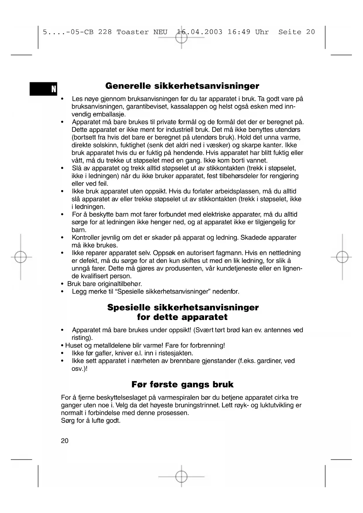 5....-05-CB 228 Toaster NEU 16.04.2003 16:49 Uhr Seite 21Garanti For apparat som vi har solgt, påtar vi oss en garanti på 24 måneder fra kjøpsdato (kassalapp). Innenfor garantitiden fjerner vi mangler på apparat eller tilbehør*) uten omkostnin- ger hvis manglene skyldes material- eller produksjonsfeil. Dette gjør vi ved reparasj- on eller – etter vår vurdering – bytting. Garantiytelser medfører ingen forlengelse av garantitiden, og det oppstår heller ikke noe krav på en ny garanti på grunn av dette! Som garantibevis gjelder kjøpsbeviset. Uten dette beviset kan du ikke få byttet eller reparert apparatet gratis. I forbindelse med garanti ber vi om at du gir hele apparatet i originalemballasjen sammen med kassalappen til din forhandler. *) Skader på tilbehørsdeler fører ikke automatisk til at du får byttet hele apparatet gratis. I slike tilfeller ber vi deg om å henvende deg til vår hotline! Glasskader eller sprekker i plastdeler er i prinsippet kostnadspliktige! Verken defekter på forbrukstilbehør og slitasjedeler (for eksempel motorkull, eltekro- ker, drivremmer, ekstra fjernbetjening, ekstra tannbørster, sagblader osv.) eller rengjøring, vedlikehold og utskifting av slitasjedeler går inn under garantien. Slike ting er derfor kostnadspliktige! Garantien utgår ved inngrep utenfra. Etter garantien Etter at garantitiden har gått ut, kan reparasjoner utføres av den aktuelle faghande- len eller reparasjonsservice mot betaling.