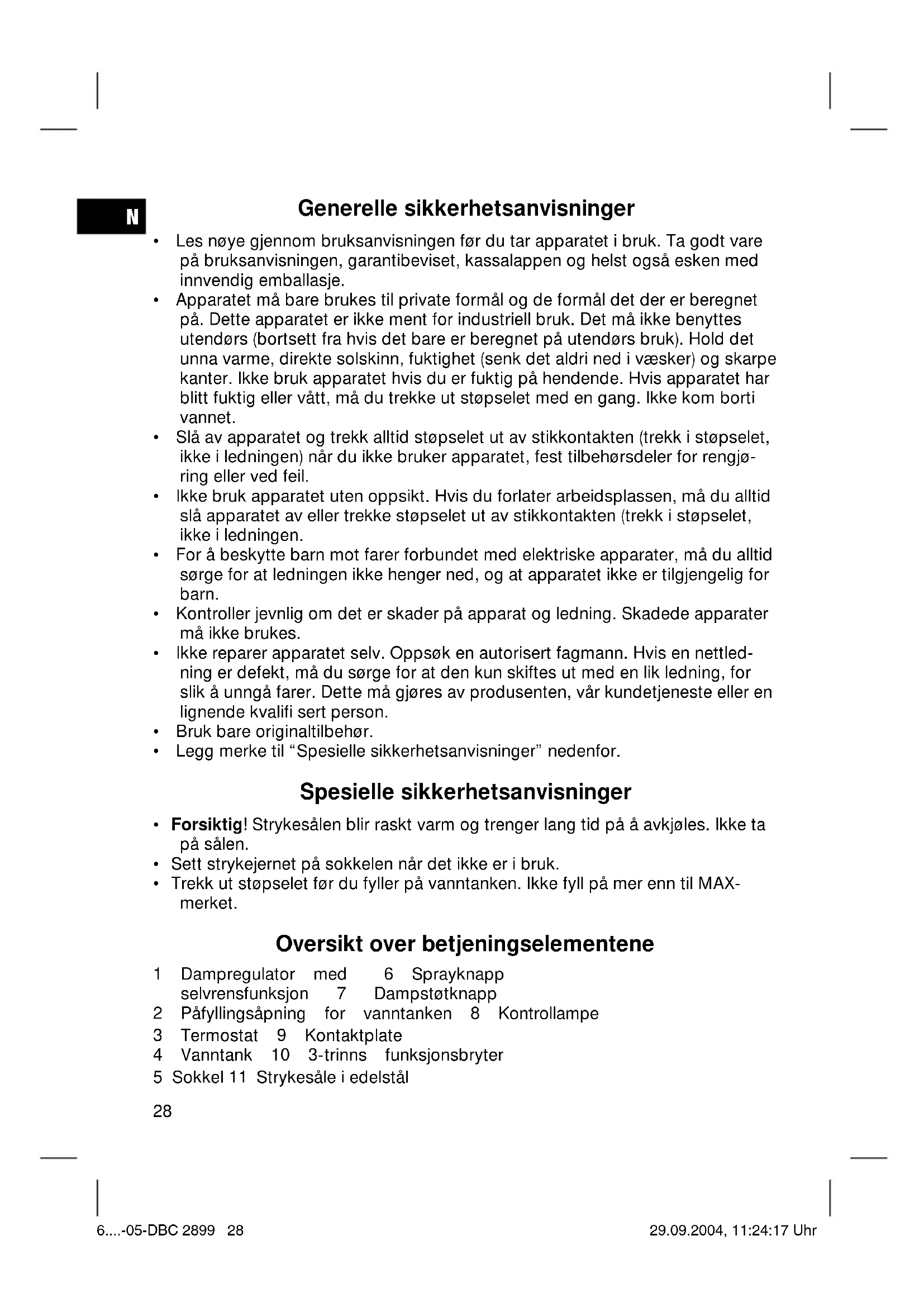 - Trekk ut støpselet før du fyller på vanntanken. Ikke fyll på mer enn til MAX- merket. Oversikt over betjeningselementene 1 Dampregulator med 6 Sprayknapp selvrensfunksjon 7 Dampstøtknapp 2 Påfyllingsåpning for vanntanken 8 Kontrollampe 3 Termostat 9 Kontaktplate 4 Vanntank 10 3-trinns funksjonsbryter 5 Sokkel 11 Strykesåle i edelstål 6....-05-DBC 2899 28 29.09.2004, 11:24:17 UhrN