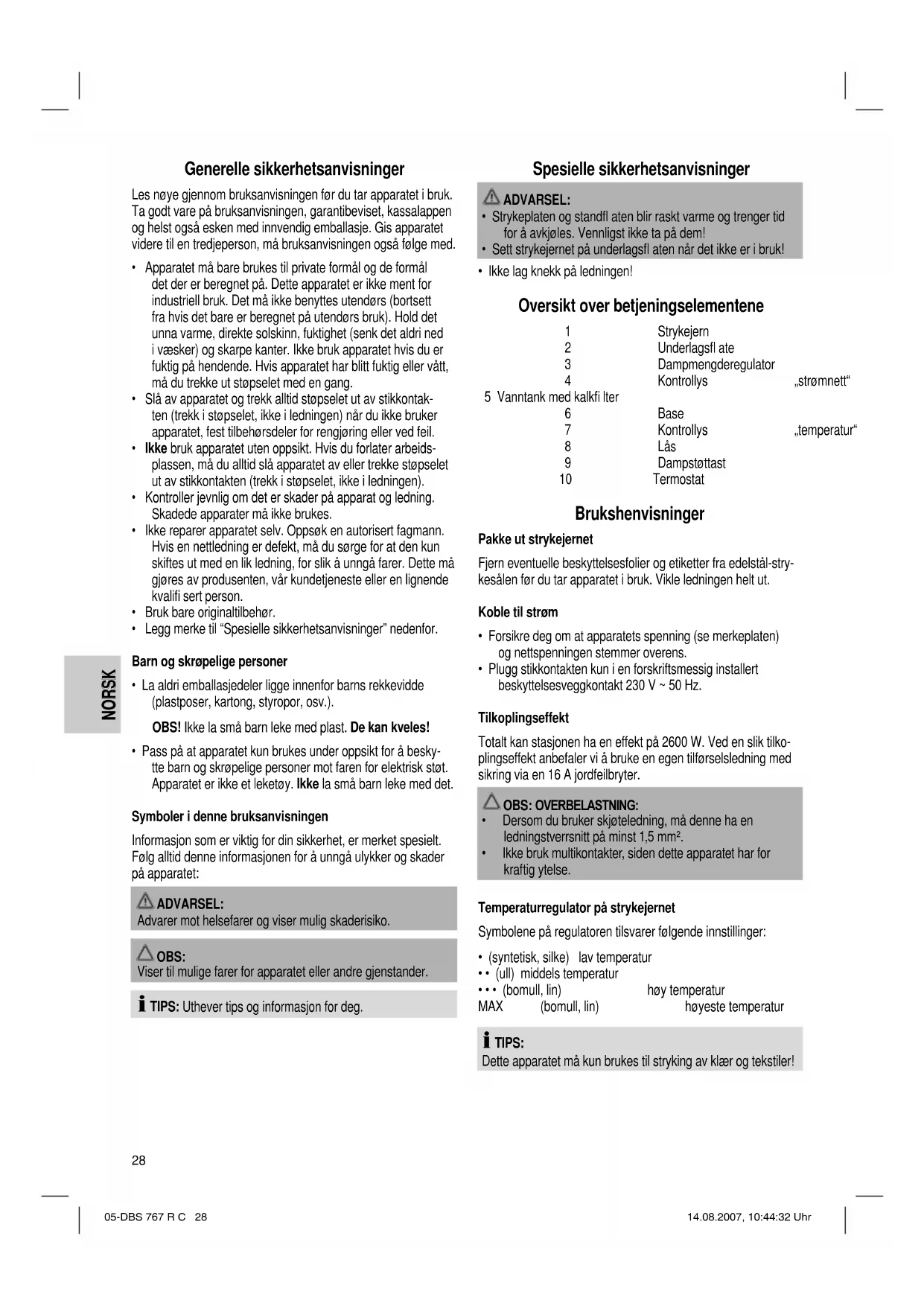 - Pass på at apparatet kun brukes under oppsikt for å besky- tte barn og skrøpelige personer mot faren for elektrisk støt. Apparatet er ikke et leketøy. Ikke la små barn leke med det. Symboler i denne bruksanvisningen Informasjon som er viktig for din sikkerhet, er merket spesielt. Følg alltid denne informasjonen for å unngå ulykker og skader på apparatet: ADVARSEL: Advarer mot helsefarer og viser mulig skaderisiko. OBS: Viser til mulige farer for apparatet eller andre gjenstander. TIPS: Uthever tips og informasjon for deg. Spesielle sikkerhetsanvisninger ADVARSEL: