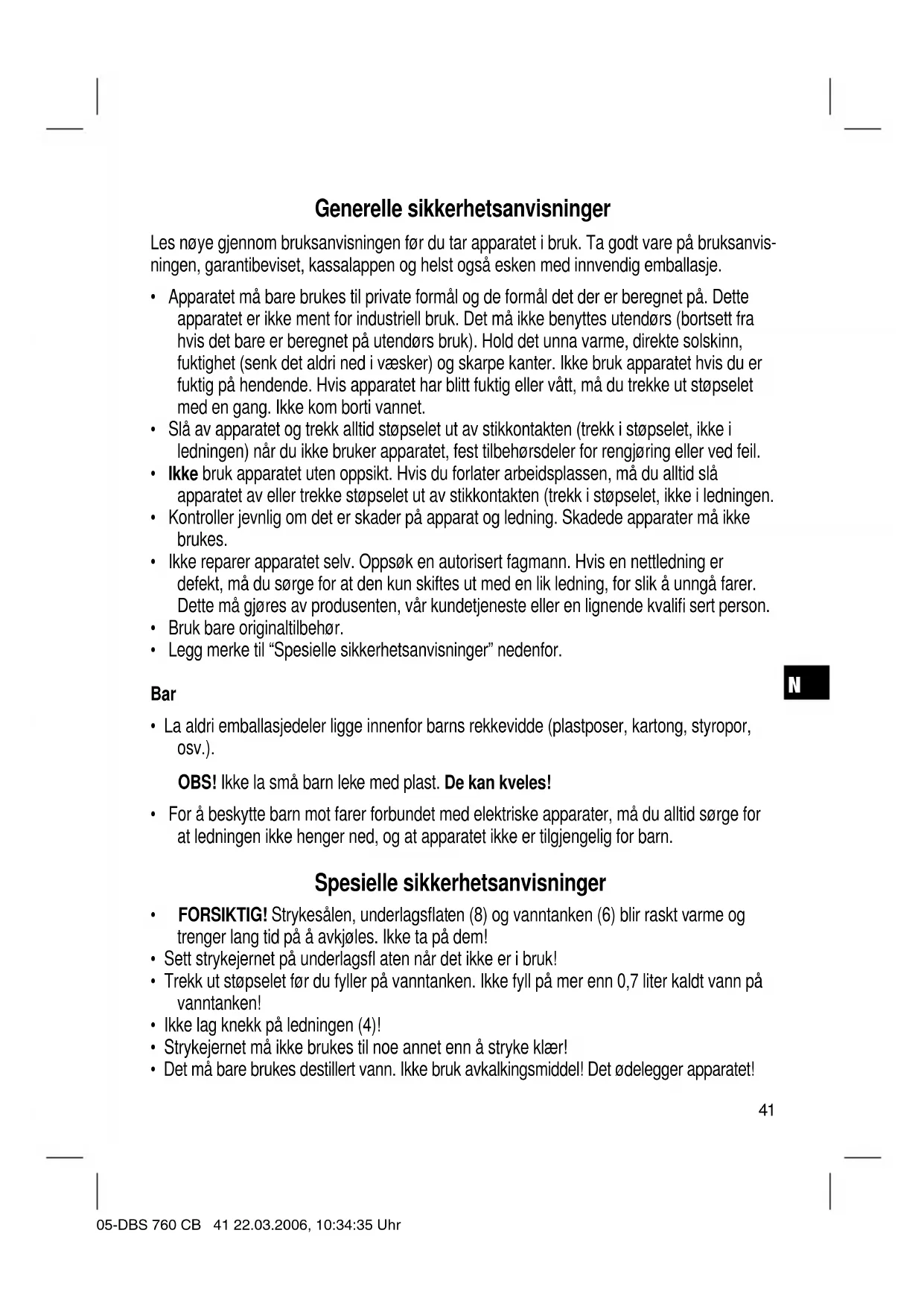 - For å beskytte barn mot farer forbundet med elektriske apparater, må du alltid sørge for at ledningen ikke henger ned, og at apparatet ikke er tilgjengelig for barn. Spesielle sikkerhetsanvisninger