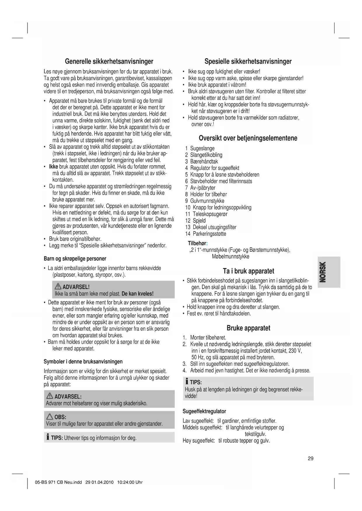 - Når du setter apparatet på høykant: Hekt kroken på sugerø- ret inn i parkeringsstøtten på undersiden av apparatet. Tekniske data Modell: .........................................................................BS 971 CB Spenningsforsyning: .................................................230 V, 50 Hz Inngangsstrøm: