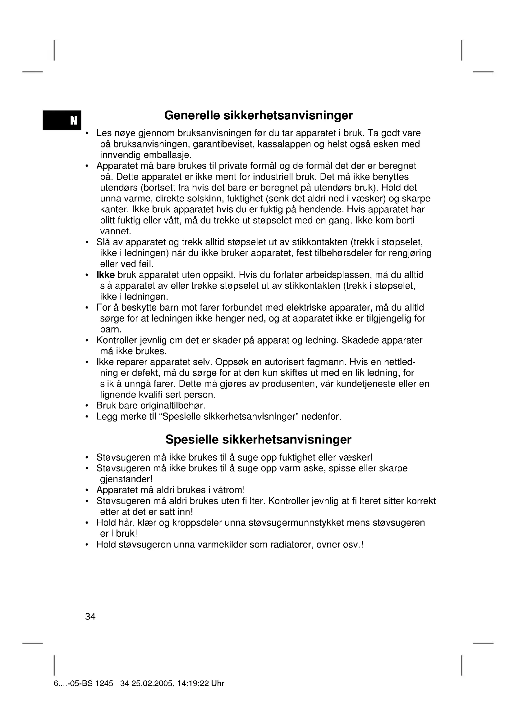 - Når du setter apparatet på høykant: Hekt kroken på sugerøret inn i parkerings- støtten på undersiden av apparatet. Dette apparatet har blitt testet i henhold til alle aktuelle CE-retningslinjer som det rammes av, f.eks. elektromagnetisk toleranse og direktiver om lavspenning. Det er laget i henhold til dagens nyeste sikkerhetstekniske forskrifter. Med forbehold om tekniske endringer! Garanti For apparat som vi har solgt, påtar vi oss en garanti på 24 måneder fra kjøpsdato (kassalapp). Innenfor garantitiden fjerner vi mangler på apparat eller tilbehør*) uten omkost- ninger hvis manglene skyldes material- eller produksjonsfeil. Dette gjør vi ved reparasjon eller – etter vår vurdering – bytting. Garantiytelser medfører ingen forlengelse av garantitiden, og det oppstår heller ikke noe krav på en ny garanti på grunn av dette! Som garantibevis gjelder kjøpsbeviset. Uten dette beviset kan du ikke få byttet eller reparert apparatet gratis. I forbindelse med garanti ber vi om at du gir hele apparatet i originalemballasjen sammen med kassalappen til din forhandler. *) Skader på tilbehørsdeler fører ikke automatisk til at du får byttet hele apparatet gratis. I slike tilfeller ber vi deg om å henvende deg til vår hotline! Glasskader eller sprekker i plastdeler er i prinsippet kostnadspliktige! 6....-05-BS 1245 37 25.02.2005, 14:19:24 UhrN