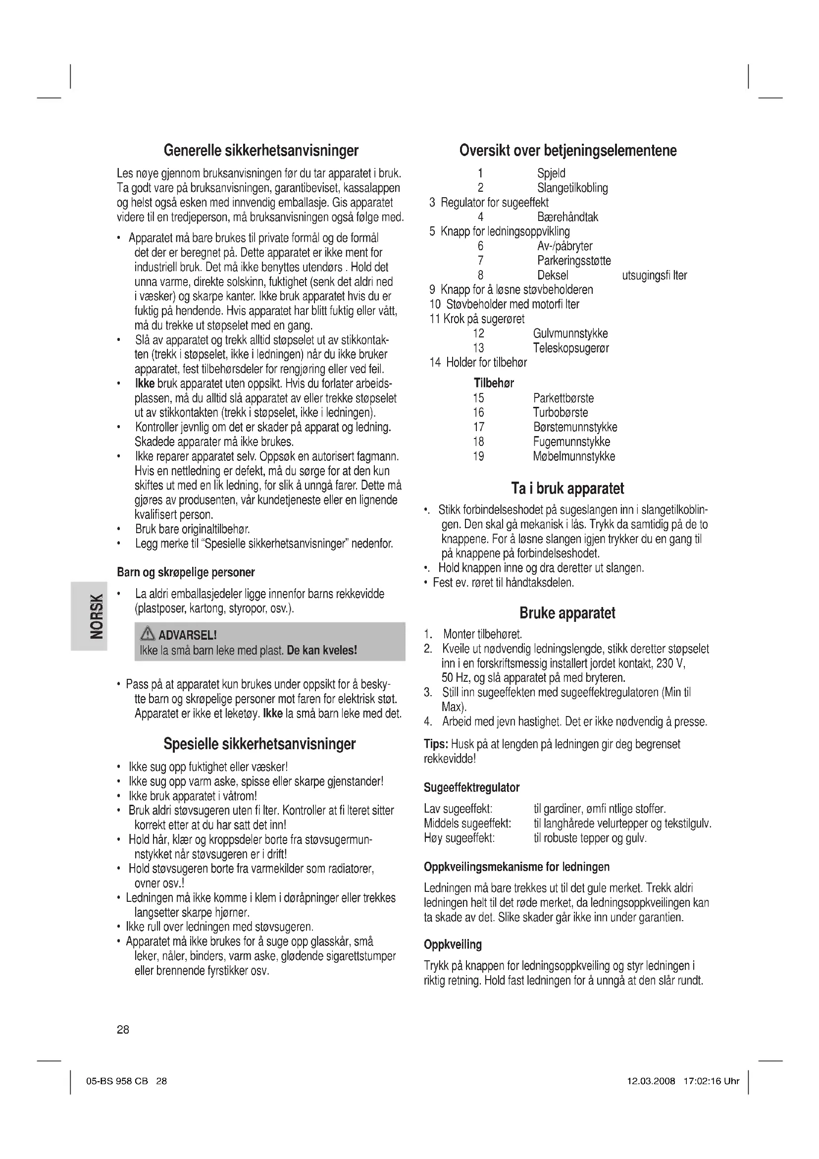 Tips: Husk på at lengden på ledningen gir deg begrenset rekkevidde! Sugeeffektregulator Lav sugeeffekt: til gardiner, ømfi ntlige stoffer. Middels sugeeffekt: til langhårede velurtepper og tekstilgulv. Høy sugeeffekt: til robuste tepper og gulv. Oppkveilingsmekanisme for ledningen Ledningen må bare trekkes ut til det gule merket. Trekk aldri ledningen helt til det røde merket, da ledningsoppkveilingen kan ta skade av det. Slike skader går ikke inn under garantien. Oppkveiling Trykk på knappen for ledningsoppkveiling og styr ledningen i riktig retning. Hold fast ledningen for å unngå at den slår rundt. 05-BS 958 CB 2805-BS 958 CB 28 12.03.2008 17:02:16 Uhr12.03.2008 17:02:16 Uhr29 NORSK NORSK Teleskoprør Røret kan justeres i høyden og dermed tilpasses individuelt til din kroppshøyde. Løsne koblingen ved å trykke på knappen i pilretningen. Skyv på rørene etter behov. For å låse dem løsner du knappen til du hører at den går i lås. Munnstykkeelement Fuge- og Børste- munnstykke: Til støvsuging av møbler, gardiner og i hjørner, sprekker osv. Møbelmunnstykke: Til rengjøring av puter, gardiner osv. Gulvmunnstykke: Til rengjøring av tepper eller glatte fl ater. Glatte gulv: Trykk spaken med børstesymbolet