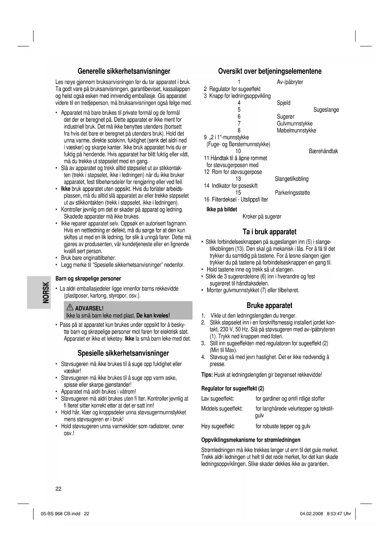 max. : ............................................................................ 1500 W Beskyttelsesklasse: ..................................................................... ΙΙ Nettovekt: .............................................................................3,4 kg Dette apparatet har blitt testet i henhold til alle aktuelle CE- retningslinjer som det rammes av, f.eks. elektromagnetisk toleranse og direktiver om lavspenning. Det er laget i henhold til dagens nyeste sikkerhetstekniske forskrifter. Med forbehold om tekniske endringer! 05-BS 968 CB.indd 2305-BS 968 CB.indd 23 04.02.2008 8:53:47 Uhr04.02.2008 8:53:47 Uhr24 NORSK NORSK Garanti For apparat som vi har solgt, påtar vi oss en garanti på 24 måneder fra kjøpsdato (kassalapp). Innenfor garantitiden fjerner vi mangler på apparat eller tilbehør uten omkostninger hvis manglene skyldes material- eller produksjonsfeil. Dette gjør vi ved reparasjon eller – etter vår vurdering – bytting. Garantiytelser medfører ingen forlengelse av garantitiden, og det oppstår heller ikke noe krav på en ny garanti på grunn av dette! Som garantibevis gjelder kjøpsbeviset. Uten dette beviset kan du ikke få byttet eller reparert apparatet gratis. I forbindelse med garanti ber vi om at du gir hele apparatet i ori- ginalemballasjen sammen med kassalappen til din forhandler. Verken defekter på forbrukstilbehør og slitasjedeler eller rengjø- ring, vedlikehold og utskifting av slitasjedeler går inn under garantien. Slike ting er derfor kostnadspliktige! Garantien utgår ved inngrep utenfra. Etter garantien Etter at garantitiden har gått ut, kan reparasjoner utføres av den aktuelle faghandelen eller reparasjonsservice mot betaling. 05-BS 968 CB.indd 2405-BS 968 CB.indd 24 04.02.2008 8:53:49 Uhr04.02.2008 8:53:49 UhrENGLISH ENGLISH