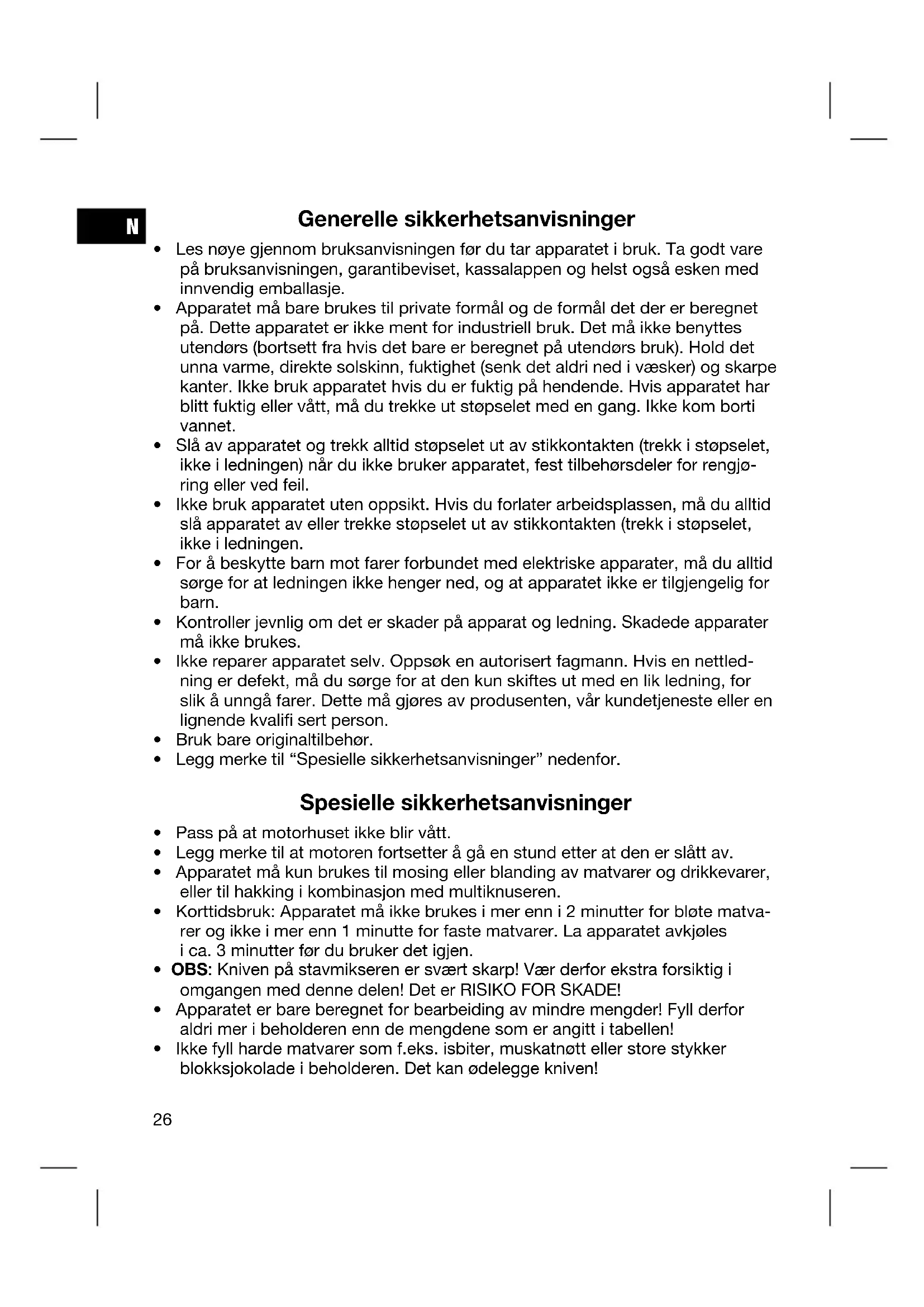 - Oppbevar blandestaven i det medfølgende veggfestet etter rengjøring. Dette apparatet har blitt testet i henhold til alle aktuelle CE-retningslinjer som det rammes av, f.eks. elektromagnetisk toleranse og direktiver om lavspenning. Det er laget i henhold til dagens nyeste sikkerhetstekniske forskrifter. Med forbehold om tekniske endringer! Garanti For apparat som vi har solgt, påtar vi oss en garanti på 24 måneder fra kjøpsdato (kassalapp). Innenfor garantitiden fjerner vi mangler på apparat eller tilbehør*) uten omkost- ninger hvis manglene skyldes material- eller produksjonsfeil. Dette gjør vi ved reparasjon eller – etter vår vurdering – bytting. Garantiytelser medfører ingen forlengelse av garantitiden, og det oppstår heller ikke noe krav på en ny garanti på grunn av dette! Som garantibevis gjelder kjøpsbeviset. Uten dette beviset kan du ikke få byttet eller reparert apparatet gratis. I forbindelse med garanti ber vi om at du gir hele apparatet i originalemballasjen sammen med kassalappen til din forhandler. *) Skader på tilbehørsdeler fører ikke automatisk til at du får byttet hele apparatet gratis. I slike tilfeller ber vi deg om å henvende deg til vår hotline! Glasskader eller sprekker i plastdeler er i prinsippet kostnadspliktige! Verken defekter på forbrukstilbehør og slitasjedeler (for eksempel motorkull, eltekroker, drivremmer, ekstra fjernbetjening, ekstra tannbørster, sagblader osv.) eller rengjøring, vedlikehold og utskifting av slitasjedeler går inn under garantien. Slike ting er derfor kostnadspliktige! Garantien utgår ved inngrep utenfra.N