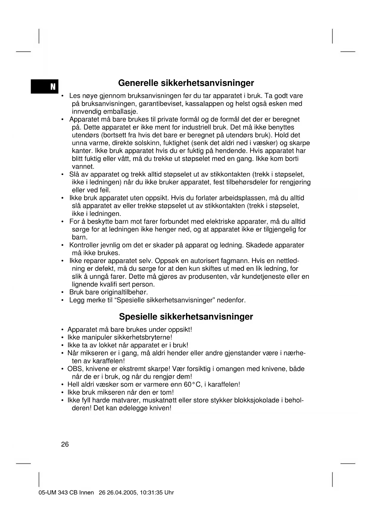 Dette apparatet har blitt testet i henhold til alle aktuelle CE-retningslinjer som det rammes av, f.eks. elektromagnetisk toleranse og direktiver om lavspenning. Det er laget i henhold til dagens nyeste sikkerhetstekniske forskrifter. Med forbehold om tekniske endringer! Garanti For apparat som vi har solgt, påtar vi oss en garanti på 24 måneder fra kjøpsdato (kassalapp). Innenfor garantitiden fjerner vi mangler på apparat eller tilbehør*) uten omkost- ninger hvis manglene skyldes material- eller produksjonsfeil. Dette gjør vi ved reparasjon eller – etter vår vurdering – bytting. Garantiytelser medfører ingen forlengelse av garantitiden, og det oppstår heller ikke noe krav på en ny garanti på grunn av dette! Som garantibevis gjelder kjøpsbeviset. Uten dette beviset kan du ikke få byttet eller reparert apparatet gratis. I forbindelse med garanti ber vi om at du gir hele apparatet i originalemballasjen sammen med kassalappen til din forhandler. *) Skader på tilbehørsdeler fører ikke automatisk til at du får byttet hele apparatet gratis. I slike tilfeller ber vi deg om å henvende deg til vår hotline! Glasskader eller sprekker i plastdeler er i prinsippet kostnadspliktige! Verken defekter på forbrukstilbehør og slitasjedeler (for eksempel motorkull, elte- kroker, drivremmer, ekstra fjernbetjening, ekstra tannbørster, sagblader osv.) eller rengjøring, vedlikehold og utskifting av slitasjedeler går inn under garantien. Slike ting er derfor kostnadspliktige! Garantien utgår ved inngrep utenfra. Etter garantien Etter at garantitiden har gått ut, kan reparasjoner utføres av den aktuelle faghan- delen eller reparasjonsservice mot betaling. 05-UM 343 CB Innen 28 26.04.2005, 10:31:36 UhrGB