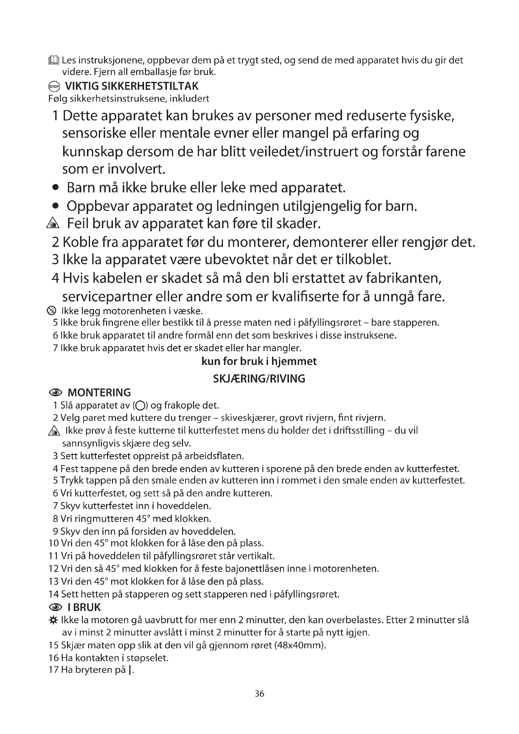 Ikke la motoren gä uavbrutt for mer enn 2 minutter, den kan overbelastes. Etter 2 minutter slå av i minst 2 minutter avslätt i minst 2 minutter for a starte på nytt igjen.