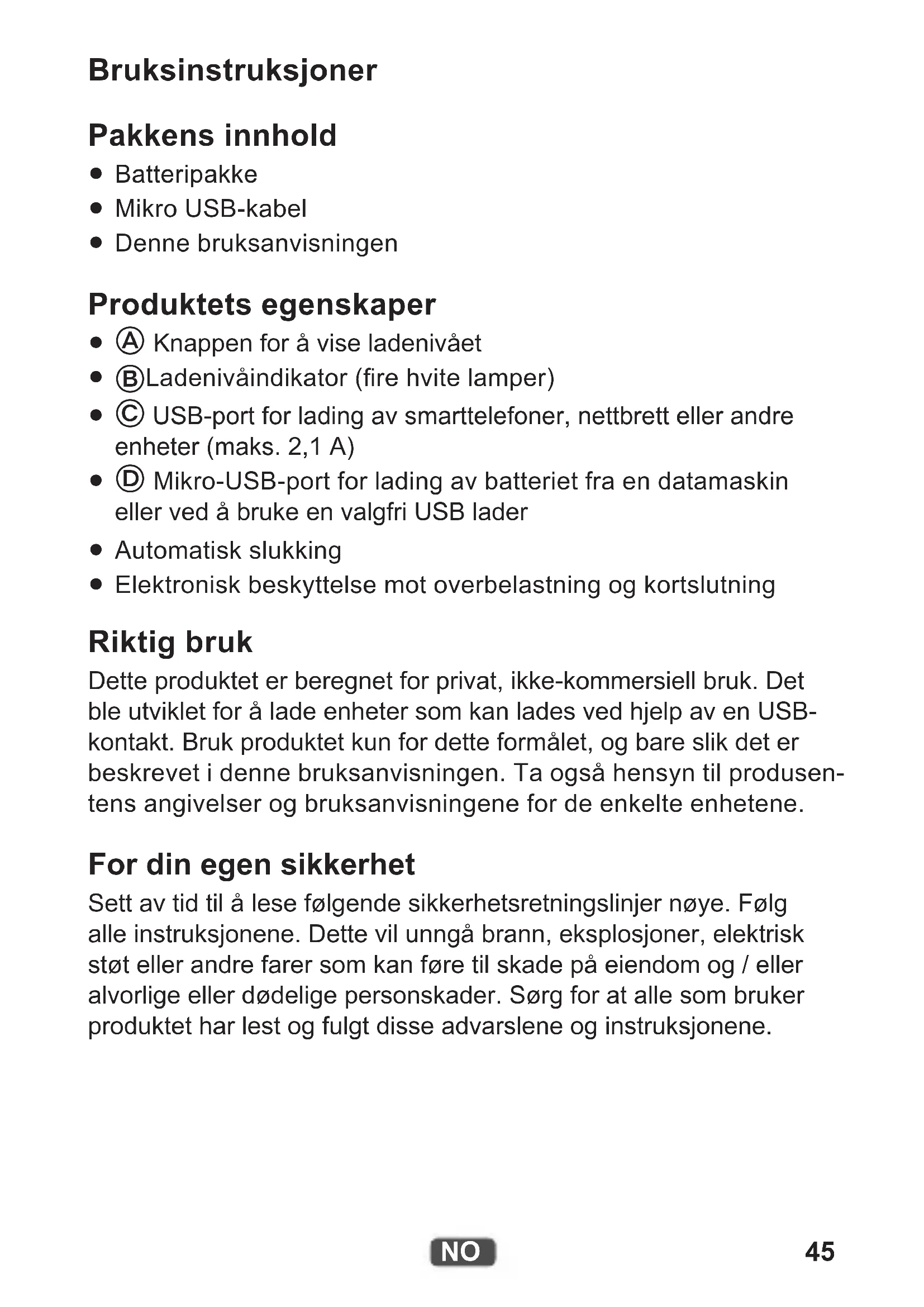 Elektronisk beskyttelse mot overbelastning og kortslutning Riktig bruk Dette produktet er beregnet for privat, ikke-kommersiell bruk. Det ble utviklet for å lade enheter som kan lades ved hjelp av en USB- kontakt. Bruk produktet kun for dette formålet, og bare slik det er beskrevet i denne bruksanvisningen. Ta også hensyn til produsen- tens angivelser og bruksanvisningene for de enkelte enhetene. For din egen sikkerhet Sett av tid til å lese følgende sikkerhetsretningslinjer nøye. Følg alle instruksjonene. Dette vil unngå brann, eksplosjoner, elektrisk støt eller andre farer som kan føre til skade på eiendom og / eller alvorlige eller dødelige personskader. Sørg for at alle som bruker produktet har lest og fulgt disse advarslene og instruksjonene.46