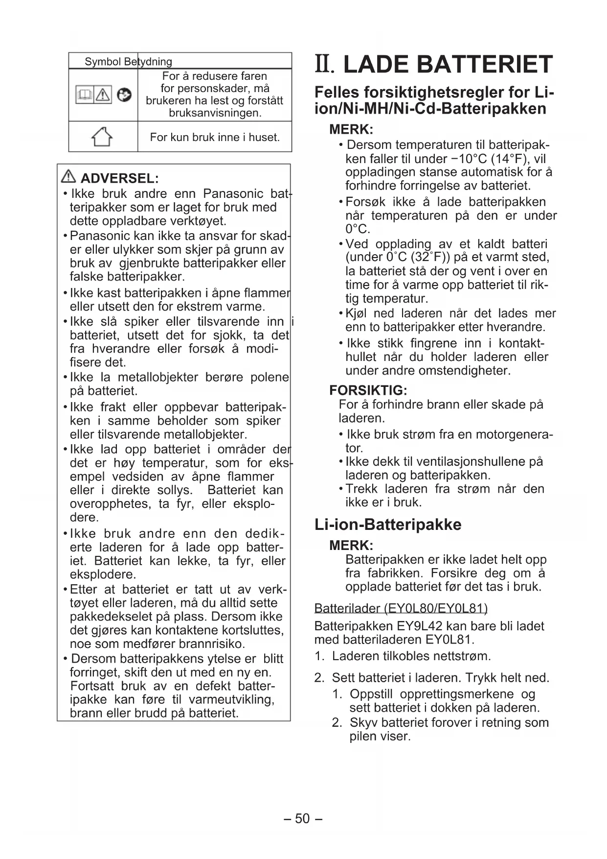 LAMPEINDIKATORER LadelampeGrønn(Venstre)Oransje(Høyre)(Kun EY0L80) Laderen koples til vekselstrømskontakten. Klar til lading. (EY0L80)(EY0L81)(EY0L80)(EY0L81) Ladingen er ferdig. (Ladet helt opp.) Batteriet er oppladet ca. 80%. (Arbeidsklar oppladning. Kun Li-ion.) Lading pågår. Batteripakke er avkjølt. Oppladingen av batteripakke foregår langsomt for å redusere belastning på batteriet. (Kun Li-ion.) Batteripakken er varm. Ladingen vil starte når batteripakkens temperatur synker. Dersom temperaturen på batteripakken er −10°C eller under, vil ladelampen (oransje) også begynne å blinke. Opladingen vil starte igjen når temperaturen på batteripakken stiger (Kun Li-ion). (EY0L80)(EY0L81)(EY0L80)(EY0L81) Lading ikke mulig. Tett av støv eller feil med batteripakken. Blinker fort Blinker Slått på Slått av Brukerinformasjon om innsamling og håndtering av gammelt utstyr og brukte batterier Slike symboler på produkter, emballasje, og/eller på medfølgende doku- menter betyr at brukte elektriske/elektroniske produkter og batterier ikke må blandes med vanlig husholdningsavfall. For riktig håndtering og gjenvinning av gamle produkter og brukte batterier, vennligst lever dem til anvendelige innsamlingssteder, i samsvar med nasjonal lovgivning og direktivene 2002/96/EC og 2006/66/EC. Ved riktig håndtering av disse produktene og batteriene, hjelper du til med å spare verdifulle ressurser og forhindre potensielle negative effekter på menneskers helse og miljøet, som ellers kan oppstå ved uriktig avfallshåndtering. For mer informasjon om innsamling og gjenvinning av gamle produkter og batterier, vennligst ta kontakt med kommunen, ditt renovasjonsselskap eller stedet der du kjøpte gjenstandene. Ukorrekt håndtering av dette avfallet kan medføre straffansvar, i overensstemmelse med nasjonal lovgivning. For forretningsdrivende brukere i EU Dersom du ønsker å kaste elektrisk og elektronisk utstyr, vennligst ta kontakt med din forhandler eller leverandør for videre informasjon. [Informasjon om håndtering i land utenfor EU] Disse symbolene gjelder bare innenfor EU. Ønsker du å kaste slike gjenstander, vennligst kontakt dine lokale myndigheter eller forhandler og spør etter riktig fremgangsmåte for håndtering.-