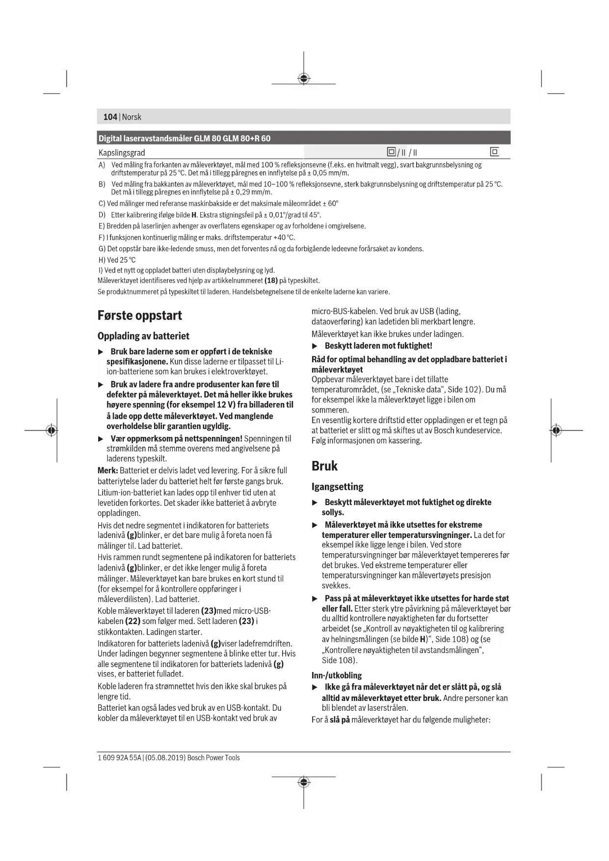 Måleverktøyet identifiseres ved hjelp av artikkelnummeret (18) på typeskiltet. Se produktnummeret på typeskiltet til laderen. Handelsbetegnelsene til de enkelte laderne kan variere. Første oppstart Opplading av batteriet u Bruk bare laderne som er oppført i de tekniske spesifikasjonene. Kun disse laderne er tilpasset til Li- ion-batteriene som kan brukes i elektroverktøyet. u Bruk av ladere fra andre produsenter kan føre til defekter på måleverktøyet. Det må heller ikke brukes høyere spenning (for eksempel 12V) fra billaderen til å lade opp dette måleverktøyet. Ved manglende overholdelse blir garantien ugyldig. u Vær oppmerksom på nettspenningen! Spenningen til strømkilden må stemme overens med angivelsene på laderens typeskilt. Merk: Batteriet er delvis ladet ved levering. For å sikre full batteriytelse lader du batteriet helt før første gangs bruk. Litium-ion-batteriet kan lades opp til enhver tid uten at levetiden forkortes. Det skader ikke batteriet å avbryte oppladingen. Hvis det nedre segmentet i indikatoren for batteriets ladenivå (g)blinker, er det bare mulig å foreta noen få målinger til. Lad batteriet. Hvis rammen rundt segmentene på indikatoren for batteriets ladenivå (g)blinker, er det ikke lenger mulig å foreta målinger. Måleverktøyet kan bare brukes en kort stund til (for eksempel for å kontrollere oppføringer i måleverdilisten). Lad batteriet. Koble måleverktøyet til laderen (23)med micro-USB- kabelen (22) som følger med. Sett laderen (23) i stikkontakten. Ladingen starter. Indikatoren for batteriets ladenivå (g)viser ladefremdriften. Under ladingen begynner segmentene å blinke etter tur. Hvis alle segmentene til indikatoren for batteriets ladenivå (g) vises, er batteriet fulladet. Koble laderen fra strømnettet hvis den ikke skal brukes på lengre tid. Batteriet kan også lades ved bruk av en USB-kontakt. Du kobler da måleverktøyet til en USB-kontakt ved bruk av micro-BUS-kabelen. Ved bruk av USB (lading, dataoverføring) kan ladetiden bli merkbart lengre. Måleverktøyet kan ikke brukes under ladingen. u Beskytt laderen mot fuktighet! Råd for optimal behandling av det oppladbare batteriet i måleverktøyet Oppbevar måleverktøyet bare i det tillatte temperaturområdet, (se „Tekniske data“, Side102). Du må for eksempel ikke la måleverktøyet ligge i bilen om sommeren. En vesentlig kortere driftstid etter oppladingen er et tegn på at batteriet er slitt og må skiftes ut av Bosch kundeservice. Følg informasjonen om kassering. Bruk Igangsetting u Beskytt måleverktøyet mot fuktighet og direkte sollys. u Måleverktøyet må ikke utsettes for ekstreme temperaturer eller temperatursvingninger. La det for eksempel ikke ligge lenge i bilen. Ved store temperatursvingninger bør måleverktøyet tempereres før det brukes. Ved ekstreme temperaturer eller temperatursvingninger kan målevertøyets presisjon svekkes. u Pass på at måleverktøyet ikke utsettes for harde støt eller fall. Etter sterk ytre påvirkning på måleverktøyet bør du alltid kontrollere nøyaktigheten før du fortsetter arbeidet (se „Kontroll av nøyaktigheten til og kalibrering av helningsmålingen (se bildeH)“, Side108) og (se „Kontrollere nøyaktigheten til avstandsmålingen“, Side108). Inn-/utkobling u Ikke gå fra måleverktøyet når det er slått på, og slå alltid av måleverktøyet etter bruk. Andre personer kan bli blendet av laserstrålen. For å slå på måleverktøyet har du følgende muligheter: 1 609 92A 55A | (05.08.2019) Bosch Power ToolsNorsk | 105 – Trykk på av/på-knappen (8): Måleverktøyet slås på, og det befinner seg i funksjonen lengdemåling. Laseren slås ikke på. – Trykk på måleknappen (2): Måleverktøyet og laseren slås på. Måleverktøyet befinner seg i funksjonen for lengdemåling. Når måleverktøyet er satt inn i måleskinnen (25), er funksjonen helningsmåling aktivert. u Rett aldri laserstrålen mot personer eller dyr, og se ikke selv inn i laserstrålen, heller ikke fra større avstand. For å slå av måleverktøyet trykker du lenge på av/på- knappen (8). Hvis ingen knapp på måleverktøyet trykkes inn i løpet av ca. 5minutter, kobles måleverktøyet automatisk ut, slik at batteriene spares. Hvis ikke vinkelen endres på ca. 5minutter i driftsmodusen "Helningsmåling", slås verktøyet automatisk av, slik at batteriene skånes. Ved en automatisk utkopling opprettholdes alle lagrede verdier. Måling Etter at måleverktøyet har blitt slått på med måleknappen (2), er det alltid i funksjonen lengdemåling eller helningsmåling når måleskinnen (25) er satt inn i måleverktøyet. Du kan stille inn andre målefunksjonen ved å trykke på den respektive funksjonsknappen (se „Målefunksjoner“, Side106). Bakkanten på måleverktøyet er stilt inn som referanseplan for målingen etter at verktøyet er slått på. Ved å trykke på knappen for referanseplan (10) kan du endre referanseplanet (se „Velge referanseplan (se bildeA)“, Side105). Legg måleverktøyet med valgt referanseplan inntil det ønskede startpunktet for målingen (foreksempel en vegg). Trykk kort på måleknappen (2) for å slå på laserstrålen. u Rett aldri laserstrålen mot personer eller dyr, og se ikke selv inn i laserstrålen, heller ikke fra større avstand. Rett inn laserstrålen mot målflaten. Trykk på nytt på måleknappen (2) igjen for å utløse målingen. Når permanent laserstråle er slått på, starter målingen allerede når måleknappen (2) har blitt trykt én gang. I funksjonen kontinuerlig måling starter målingen straks funksjonen slås på. Måleverdien vises vanligvis innen 0,5s, og senest etter 4s. Varigheten på målingen avhenger av avstanden, lysforholdene og målflatens refleksjonsegenskaper. Slutten på målingen indikeres av et lydsignal. Etter utført måling slås laserstrålen automatisk av. Hvis det ikke utføres noen måling ca. 20s etter siktingen, slås laserstrålen automatisk av, 